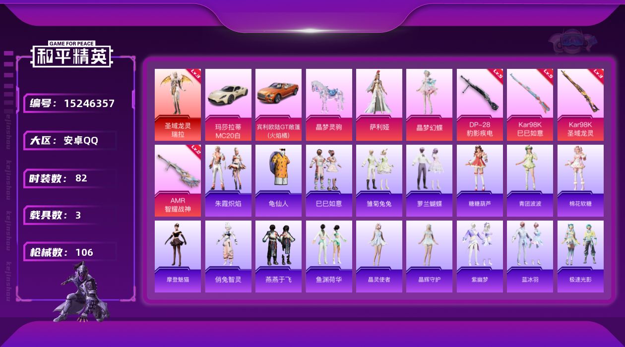 [15246357]素材身法号/璀璨碎片1888【特价急出/详情看图】:安卓 手Q-1神装-2粉装-4特效枪-3载具-1粉色飞行器-3.4w热力值-8王牌印记-82套装-106枪皮【红色神装等级】:圣域龙灵-瑞拉(三级)【热门品类】:套装-龟仙人【粉色载具】:玛莎拉蒂MC20(星石白),宾利欧陆GT敞篷(火焰橘),晶梦灵驹【粉色套装】:角色-萨利娅,角色-晶梦幻蝶【粉色枪皮等级】:Kar98K-巳巳如意(五级),Kar98K-圣域龙灵(三级),AMR-智耀战神(二级),DP-28-豹影疾电(五级)【粉色飞行器】:圣域金龙飞行器