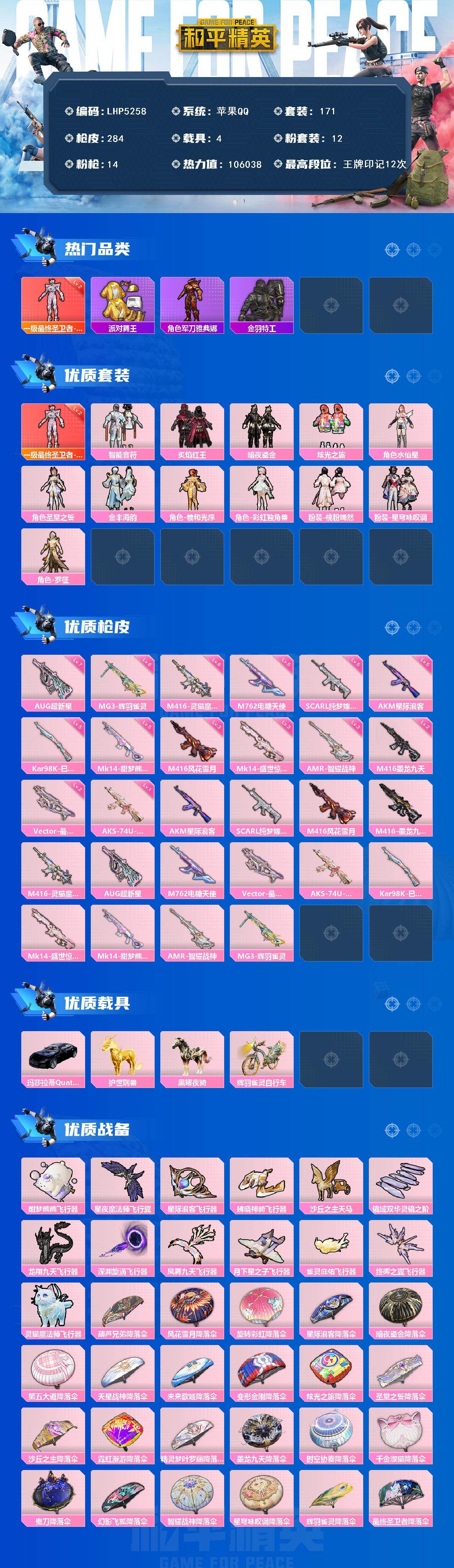 [15257072]素材身法号【特价急出/详情看图】:苹果 手Q-1神装-12粉装-14特效枪-4载具-14粉色飞行器-10.6w热力值-12王牌印记-171套装-284枪皮【红色神装等级】:最终圣卫者-帕修斯(二级)【热门品类】:套装-浪漫天命,套装-派对舞王,角色-军刀雅典娜,套装-金羽特工,套装-龟仙人,套装-红红火火,角色-Mark.06【粉色载具】:玛莎拉蒂Quattroporte(夜幕蓝),护世瑞兽,黑曜夜骑,辉羽雀灵自行车【粉色套装】:粉装-智能音符,粉装-炙焰红王,粉装-暗夜鎏金,粉装-炫光之旅,角色-水仙星,角色-圣堂之誓,粉装-金丰海韵,角色-羲和光序,角色-彩虹独角兽,粉装-桃粉嫣然,粉装-星穹咏叹调,角色-罗征【粉色枪皮等级】:AKM-星际浪客(五级),SCAR-L-纯梦嫁纱(五级),M416-风花雪月(三级),M416-墨龙九天(二级),M416-灵猫魔法师(六级),AUG-超新星(七级),M762-电糖天使(五级),Vector-最终圣卫者(二级),AKS-74U-星穹咏叹调(一级),Kar98K-巳巳如意(五级),Mk14-盛世惊鸿(三级),Mk14-甜梦熊击(五级),AMR-智耀战神(三级),MG3-辉羽雀灵(六级)【粉色飞行器】:酣梦熊熊飞行器,星夜魔法师飞行翼,星际浪客飞行器,拂晓神骑飞行器,沙丘之主天马,镜域双华-灵镜之阶,龙翔九天飞行器,深渊漩涡飞行器,凤舞九天飞行器,月下星之子飞行器,雀灵庇佑飞行器,终晖之翼飞行器,灵猫魔法师飞行器
