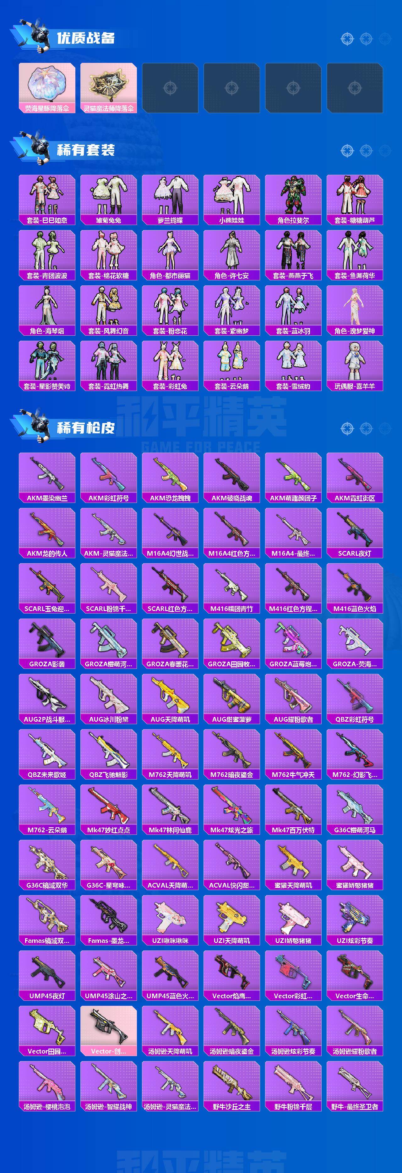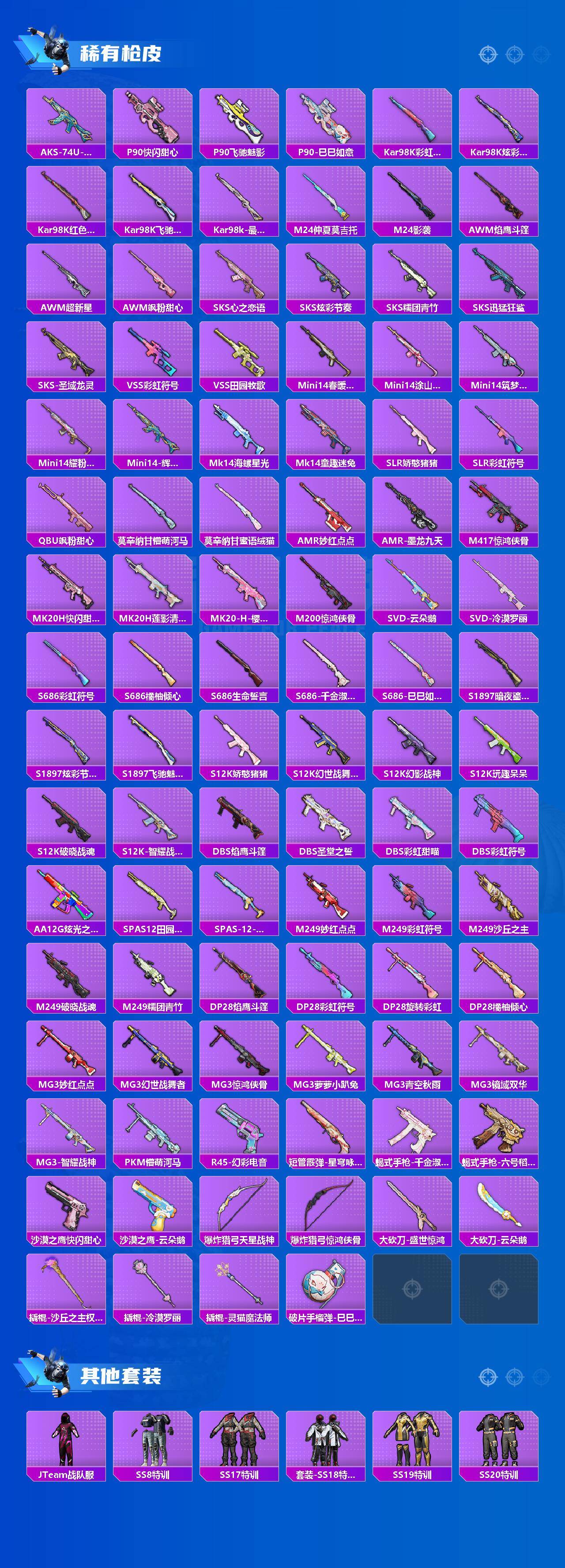 AKM-星际浪客,SCAR-L-纯梦嫁纱,M416-风花雪月,M416-墨龙九天,AUG-超新星,M762-电糖天使,Kar98K-巳巳如意,Mk14-盛世惊鸿