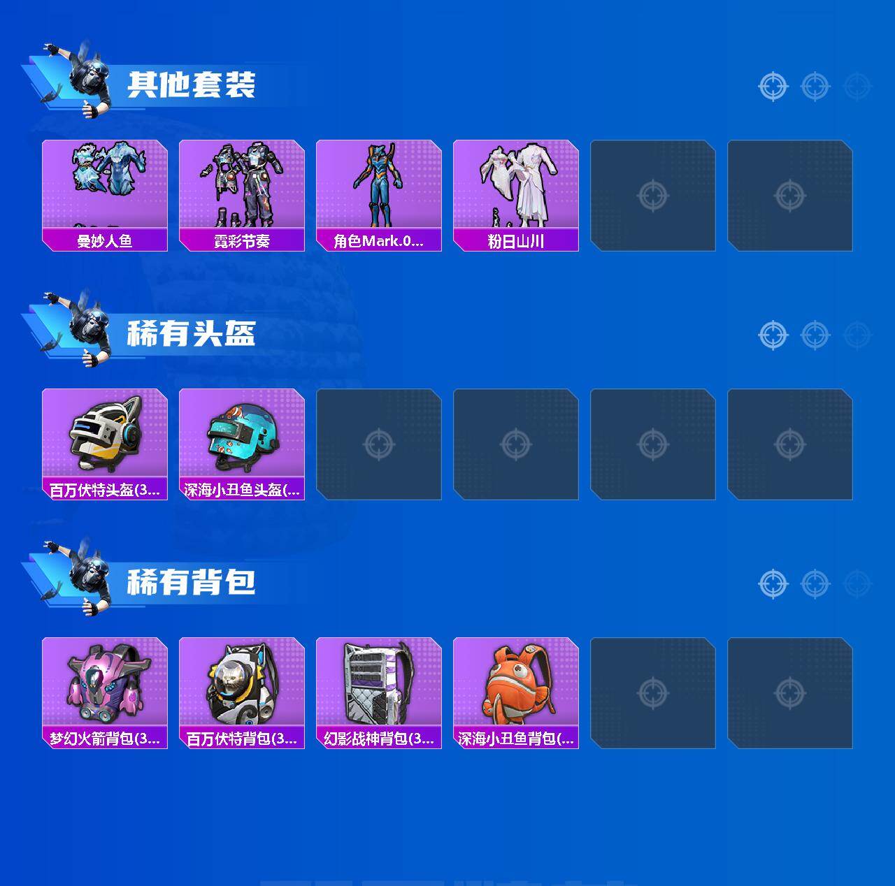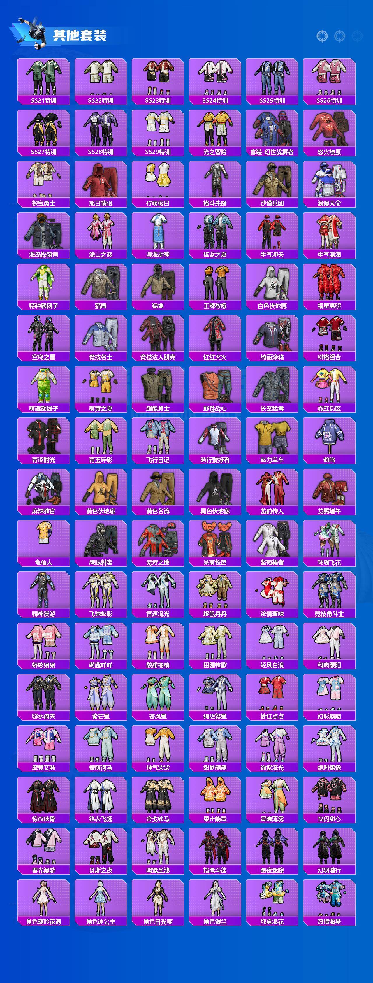 套装-派对舞王,套装-智能音符,套装-炙焰红王,套装-暗夜鎏金,套装-炫光之旅,角色-水仙星,角色-圣堂之誓,套装-金丰海韵,角色-彩虹独角兽,套装-桃粉嫣然,套装-鹰眼刺客,套装-呆萌铁蟹