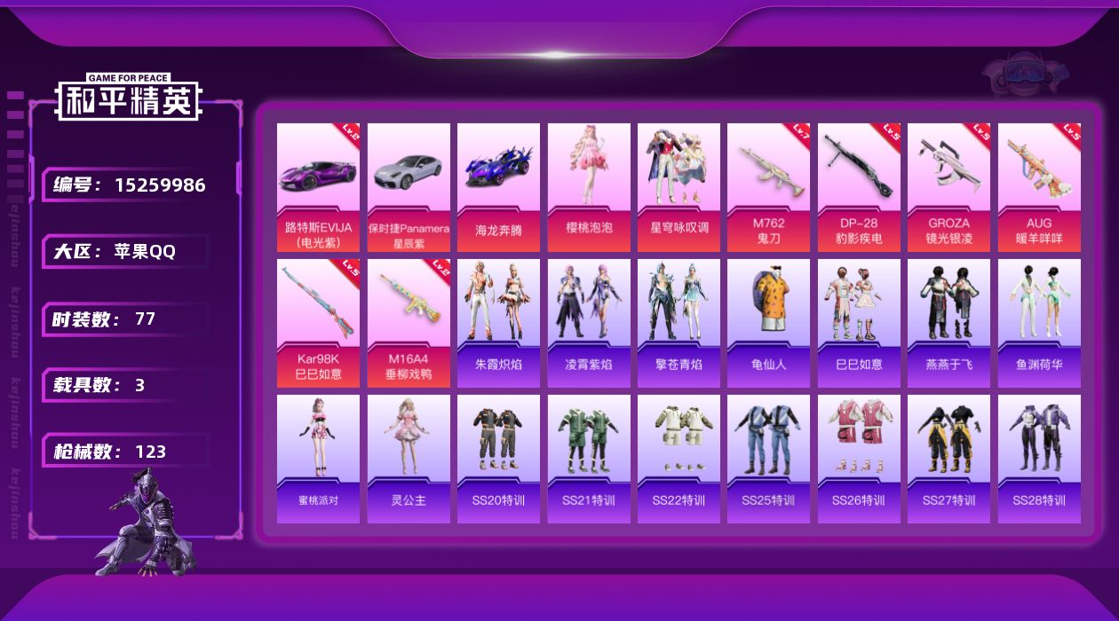 - PX_2101474-??/枪械15/装备363/载具5/战备175/王牌印记13/热力值98248/五级AKM-绿萝繁花/五级AKM-星际浪客/三级AKM-幽焰骑士/五级SCAR-L-锦绣绵绵/一级M416-心之恋语/一级M416-五爪金龙/三级M416-墨龙九天/五级M416-电玩时刻/九级M416-至情至圣/四级GROZA-香水柠檬/一级GROZA-精灵之光/五级M762-青锋波束/三级AK