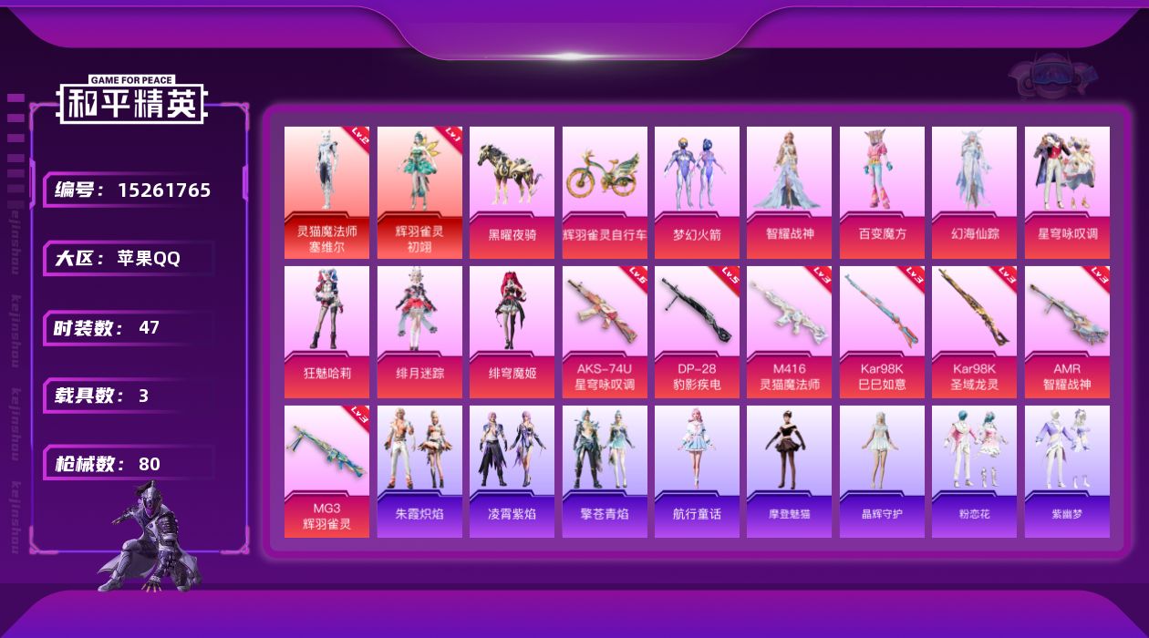 [15261765]【店主推荐捡漏号!可直接换绑】/素材身法号 苹果 手Q-3神装-8粉装-7特效枪-2载具-5粉色飞行器-3.3w热力值-1王牌印记-47套装-80枪皮【红色神装等级】:灵猫魔法师-塞维尔(二级),辉羽雀灵-初翊(一级)【热门品类】:粉装-梦幻火箭【粉色载具】:僚机-圣域龙宝,黑曜夜骑,辉羽雀灵自行车【粉色套装】:粉装-梦幻火箭,角色-智耀战神,粉装-百变魔方,角色-幻海仙踪,粉装-星穹咏叹调,角色-狂魅哈莉,角色-绯月迷踪,角色-绯穹魔姬【粉色枪皮等级】:M416-灵猫魔法师(三级),AKS-74U-星穹咏叹调(六级),Kar98K-巳巳如意(三级),Kar98K-圣域龙灵(三级),AMR-智耀战神(三级),DP-28-豹影疾电(五级),MG3-辉羽雀灵(三级)【粉色飞行器】:圣域金龙飞行器,百变魔方飞行器,雀灵庇佑飞行器,灵猫魔法师飞行器,灵珠游龙飞行器