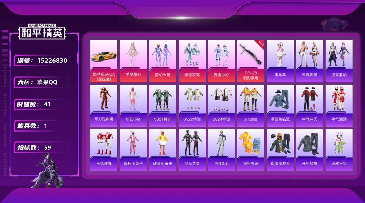 [15226830]【店主推荐捡漏号!可直接换绑】 苹果 手Q-4粉装-1特效枪-1载具-1粉色飞行器-1.9w热力值-3王牌印记-41套装-59枪皮【热门品类】:粉装-梦幻火箭,角色-军刀雅典娜,套装-粉红小猪【粉色载具】:路特斯EVIJA(星际黄)【粉色套装】:粉装-梦幻火箭,粉装-傲雪凌霜,粉装-霁雪冰心,角色-羊梦糖心【粉色枪皮等级】:DP-28-豹影疾电(五级)