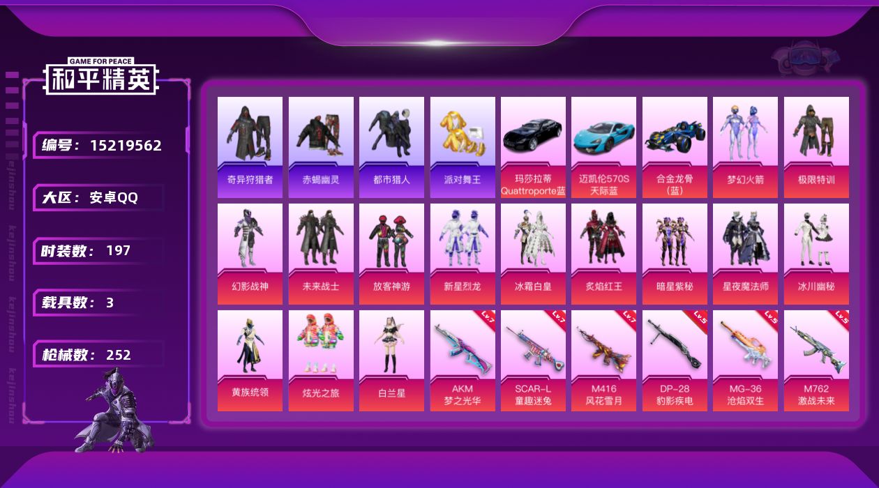 [15219562]【店主推荐捡漏号!可直接换绑】/素材身法号 安卓 手Q-14粉装-12特效枪-3载具-5粉色飞行器-8.9w热力值-19王牌印记-197套装-252枪皮【热门品类】:粉装-梦幻火箭,套装-浪漫天命,套装-赤蝎幽灵,套装-都市猎人,套装-派对舞王,套装-奇异狩猎者,套装-金羽特工,套装-暗夜行者,套装-龟仙人,套装-暗影哥特,角色-8号机,角色-Mark.06【粉色载具】:玛莎拉蒂Quattroporte(夜幕蓝),迈凯伦570S(天际蓝),合金龙骨(蓝)【粉色套装】:粉装-极限特训,粉装-幻影战神,粉装-未来战士,粉装-梦幻火箭,粉装-放客神游,粉装-新星烈龙,粉装-冰霜白皇,粉装-炙焰红王,粉装-暗星紫秘,粉装-星夜魔法师,粉装-冰川幽秘,粉装-黄族统领,粉装-炫光之旅,角色-白兰星【粉色枪皮等级】:AKM-梦之光华(七级),AKM-星际浪客(一级),SCAR-L-童趣迷兔(七级),M416-五爪金龙(二级),M416-风花雪月(七级),M762-激战未来(五级),UMP45-启明星(五级),Vector-环太平洋(五级),Kar98K-巳巳如意(五级),DP-28-圣堂之誓(五级),DP-28-豹影疾电(五级),MG-36-沧焰双生(五级)【粉色飞行器】:梦幻火箭飞行器,甜梦小狐飞行器,星夜魔法师飞行翼,全功率超战飞行器,黄族统领飞行器
