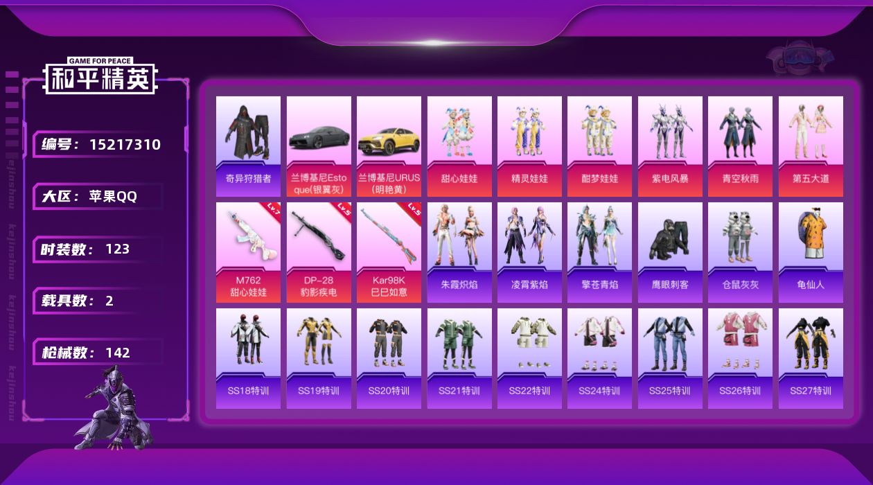 [15217310]【店主推荐捡漏号!可直接换绑】/地铁满天赋 苹果 手Q-6粉装-3特效枪-2载具-1粉色飞行器-4.3w热力值-12王牌印记-123套装-142枪皮【热门品类】:套装-奇异狩猎者,套装-龟仙人【粉色载具】:兰博基尼Estoque(银翼灰),兰博基尼URUS(明艳黄)【粉色套装】:粉装-甜心娃娃,粉装-精灵娃娃,粉装-酣梦娃娃,粉装-紫电风暴,粉装-青空秋雨,粉装-第五大道【粉色枪皮等级】:M762-甜心娃娃(七级),Kar98K-巳巳如意(五级),DP-28-豹影疾电(五级)