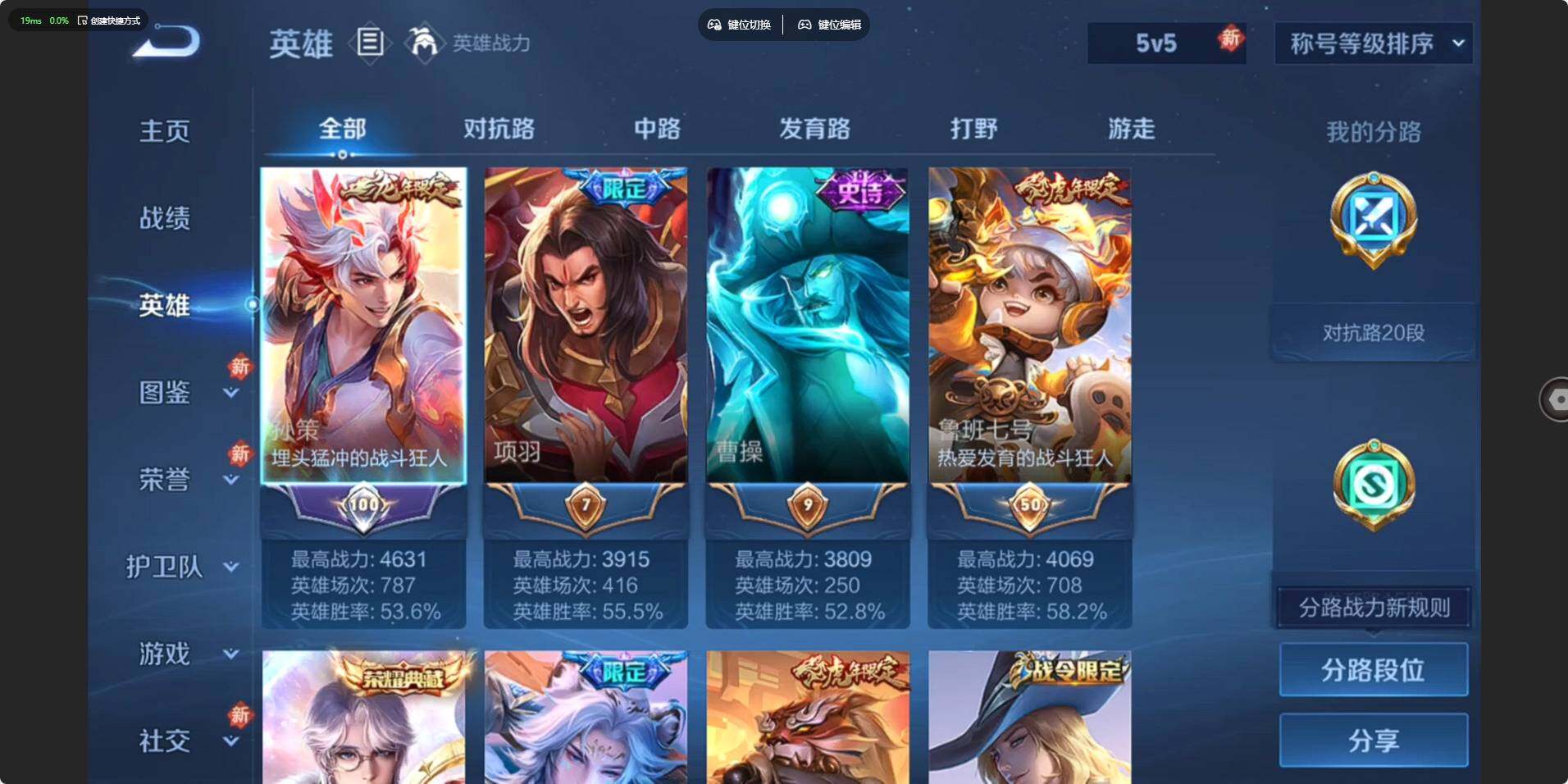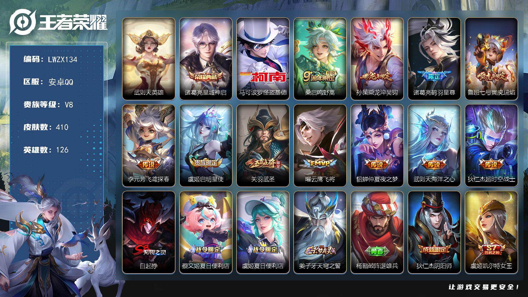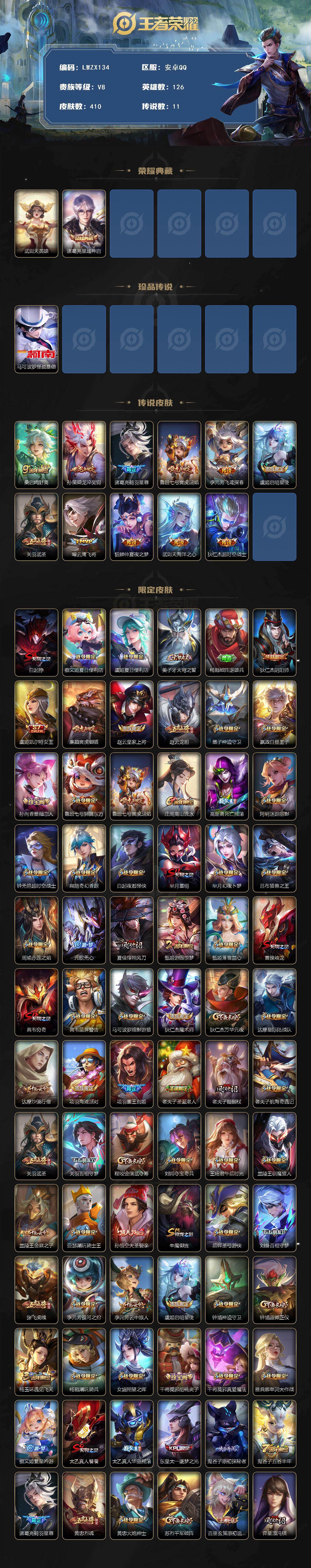 [15622304]【特价出售/店主推荐】安卓Q-V8-至尊星耀II段位-126英雄-410皮肤-1典藏皮肤-1典藏英雄-1珍品传说-11传说-120史诗