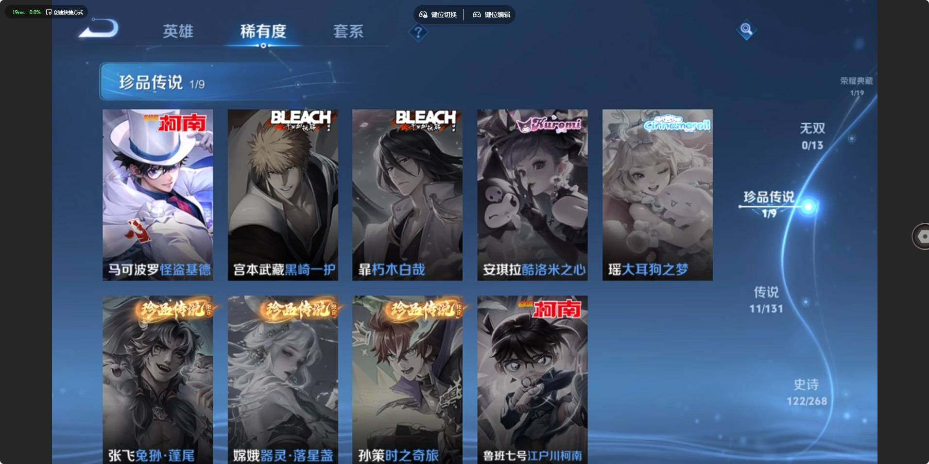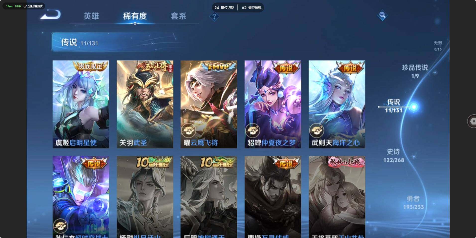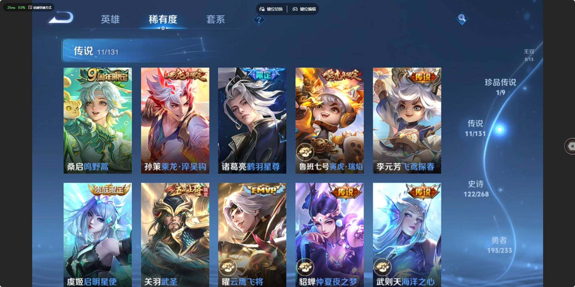 【传说皮肤】:桑启鸣野蒿,孙策乘龙淬吴钩,诸葛亮鹤羽星尊,鲁班七号寅虎瑞焰,李元芳飞鸢探春,虞姬启明星使,关羽武圣,曜云鹰飞将,貂蝉仲夏夜之梦,武则天海洋之心,狄仁杰超时空战士