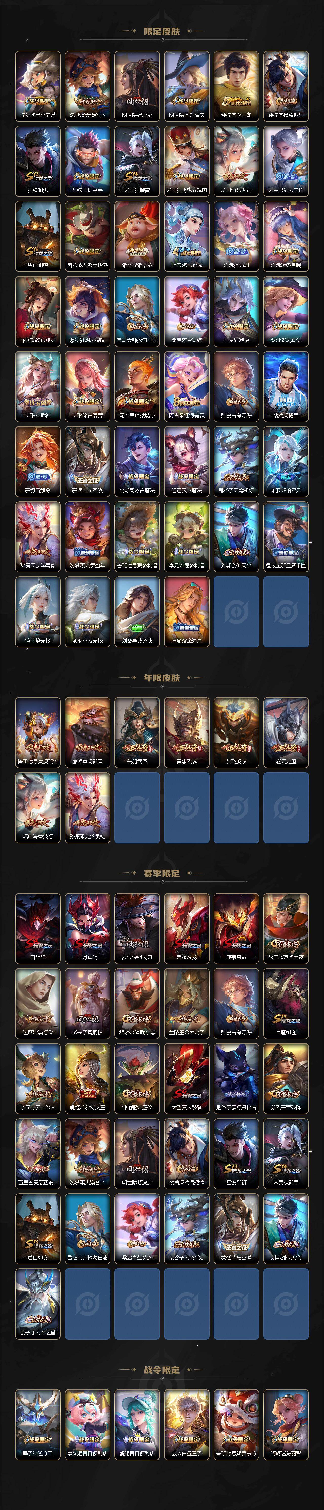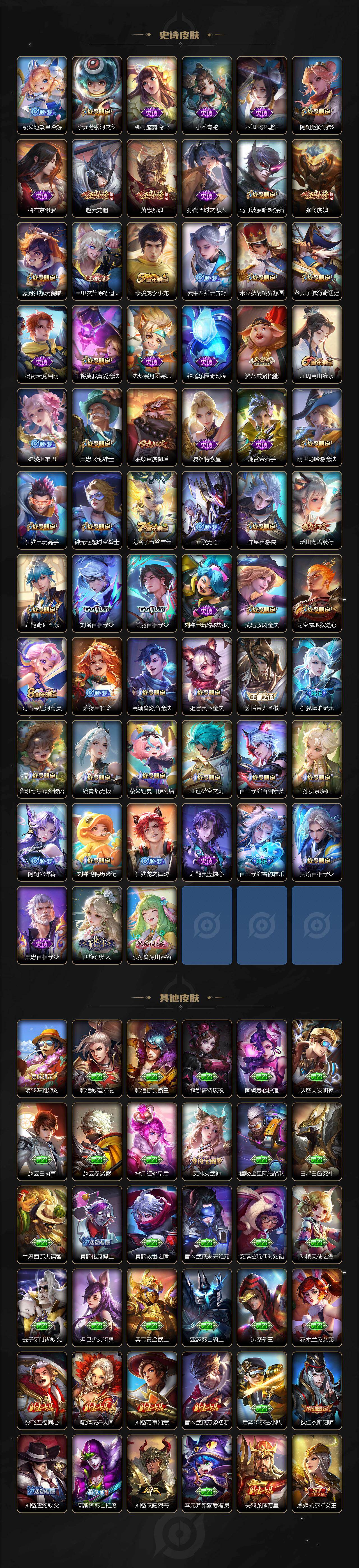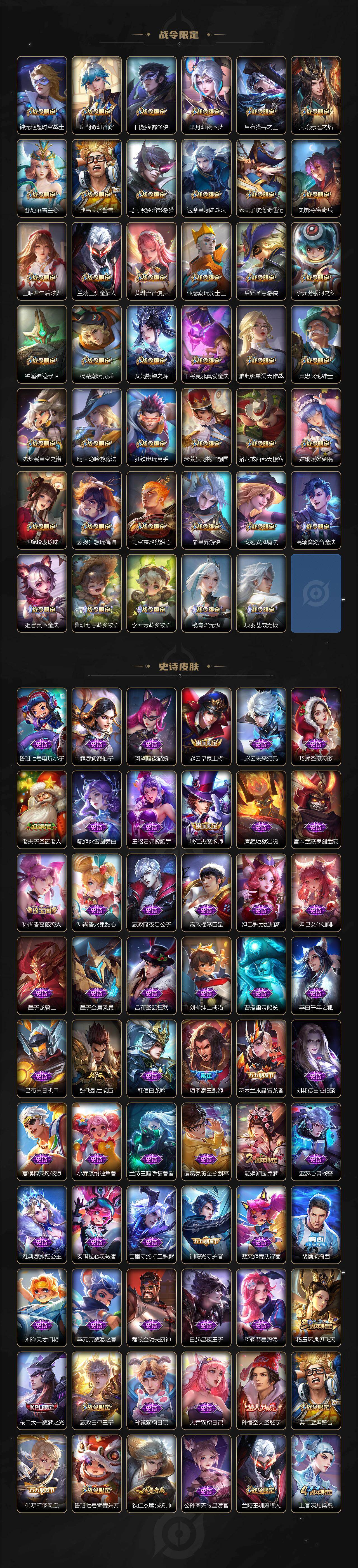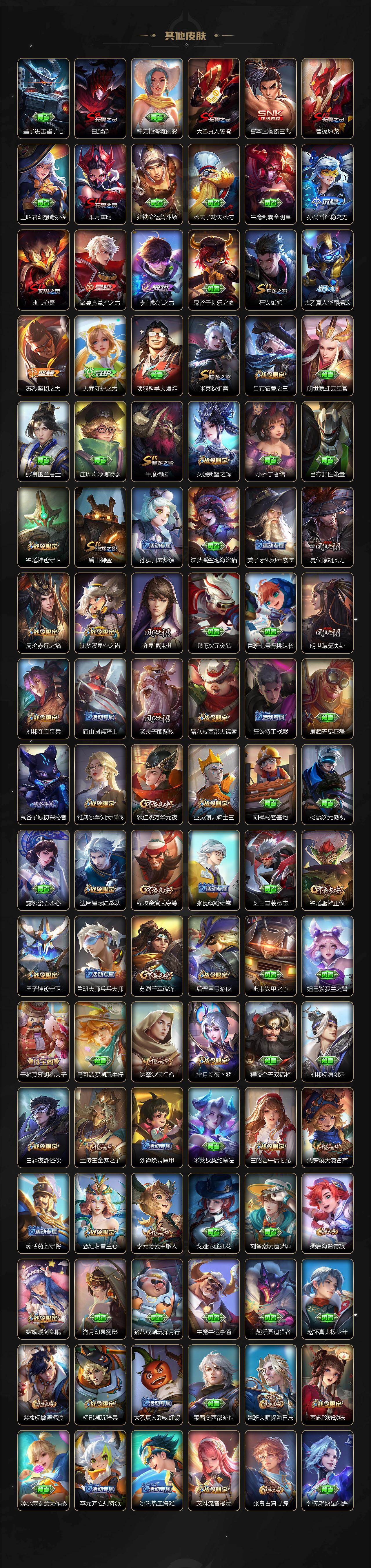 【限定皮肤】:白起狰,蔡文姬夏日便利店,虞姬夏日便利店,姜子牙天穹之誓,杨戬破阵退雄兵,狄仁杰阴阳师,虞姬凯尔特女王,廉颇寅虎御盾,赵云皇家上将,赵云龙胆,墨子神迹守卫,嬴政白昼王子,孙尚香蔷薇恋人,鲁班七号狮舞东方,鲁班七号寅虎瑞焰,庄周高山流水,高渐离死亡摇滚,阿轲迷踪丽影,钟无艳超时空战士,扁鹊奇幻香踪,白起夜都怪侠,芈月重明,芈月幻夜卜梦,吕布猎兽之王,周瑜赤莲之焰,元歌无心,夏侯惇朔风刀,甄姬游园惊梦,甄姬落雪兰心,曹操烛龙,典韦穷奇,典韦蓝屏警告,马可波罗暗影游猎,狄仁杰魔术师,狄仁杰万华元夜,达摩星际陆战队,达摩沙漠行僧,项羽海滩派对,项羽霸王别姬,老夫子圣诞老人,老夫子醍醐杖,老夫子航海奇遇记,关羽武圣,关羽百相守梦,程咬金演武夺筹,刘邦夺宝奇兵,王昭君午后时光,兰陵王驯魔猎人,兰陵王金庭之子,亚瑟潮玩骑士王,孙悟空大圣娶亲,牛魔御旌,后羿圣弓游侠,刘备百相守梦,张飞虎魄,李元芳银河之约,李元芳云中旅人,虞姬启明星使,钟馗神迹守卫,钟馗驱傩正仪,杨玉环遇见飞天,杨戬潮玩骑兵,女娲朔望之晖,干将莫邪胡桃夹子,干将莫邪真爱魔法,雅典娜单词大作战,蔡文姬繁星吟游,太乙真人饕餮,太乙真人华丽摇滚,东皇太一逐梦之光,鬼谷子原初探秘者,鬼谷子五谷丰年,诸葛亮鹤羽星尊,黄忠烈魂,黄忠火炮绅士,苏烈千军破阵,百里玄策原初追逐者,弈星混沌棋,沈梦溪星空之诺,沈梦溪大漠名商,明世隐疑决卦,明世隐吟游魔法,裴擒虎李小龙,裴擒虎擒涛扼浪,狂铁御狮,狂铁电玩高手,米莱狄御霄,米莱狄胡桃异想国,瑶山海碧波行,云中君纤云弄巧,盾山御銮,猪八戒西部大镖客,猪八戒猪悟能,上官婉儿梁祝,嫦娥拒霜思,嫦娥暖冬兔眠,西施玲珑珍味,蒙犽狂想玩偶喵,鲁班大师探海日志,桑启海盐诗旅,暃星界游侠,戈娅驭风魔