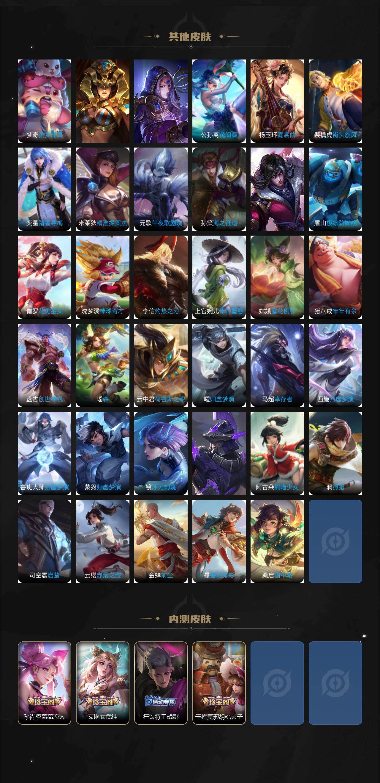虞姬凯尔特女王,白起狰,太乙真人饕餮,曹操烛龙,芈月重明,典韦穷奇,狂铁御狮,米莱狄御霄,牛魔御旌,盾山御銮,夏侯惇朔风刀,明世隐疑决卦,老夫子醍醐杖,鬼谷子原初探秘者,狄仁杰万华元夜,程咬金演武夺筹,钟馗驱傩正仪,苏烈千军破阵,吕布猎兽之王,嬴政白昼王子,女娲朔望之晖,典韦蓝屏警告,钟馗神迹守卫,鲁班七号狮舞东方,沈梦溪星空之诺,李元芳银河之约,刘邦夺宝奇兵,马可波罗暗影游猎,蒙犽狂想玩偶喵,弈星混沌棋,达摩沙漠行僧,兰陵王金庭之子,沈梦溪大漠名商,李元芳云中旅人,桑启海盐诗旅,裴擒虎擒涛扼浪,鲁班大师探海日志,张良古海寻踪,项羽苍威无极,镜青焰无极