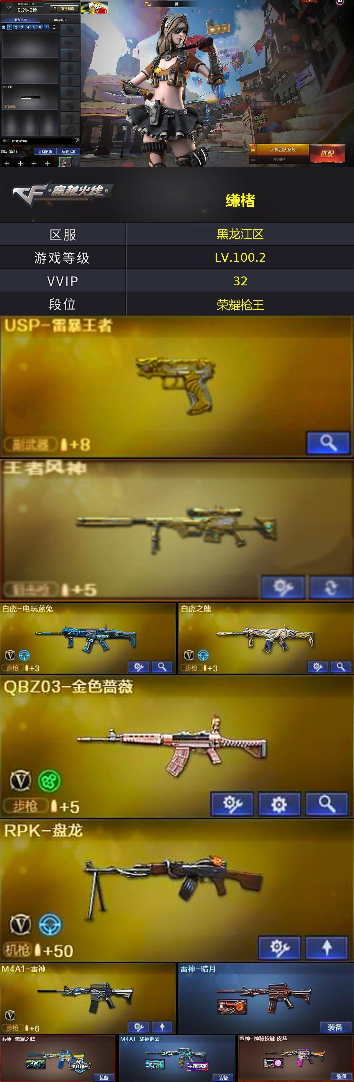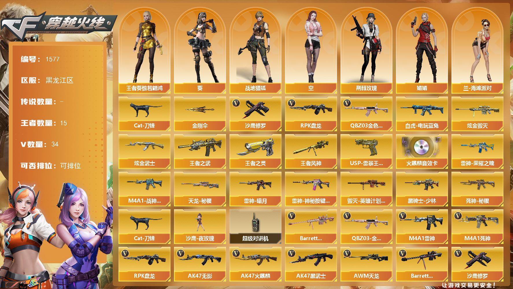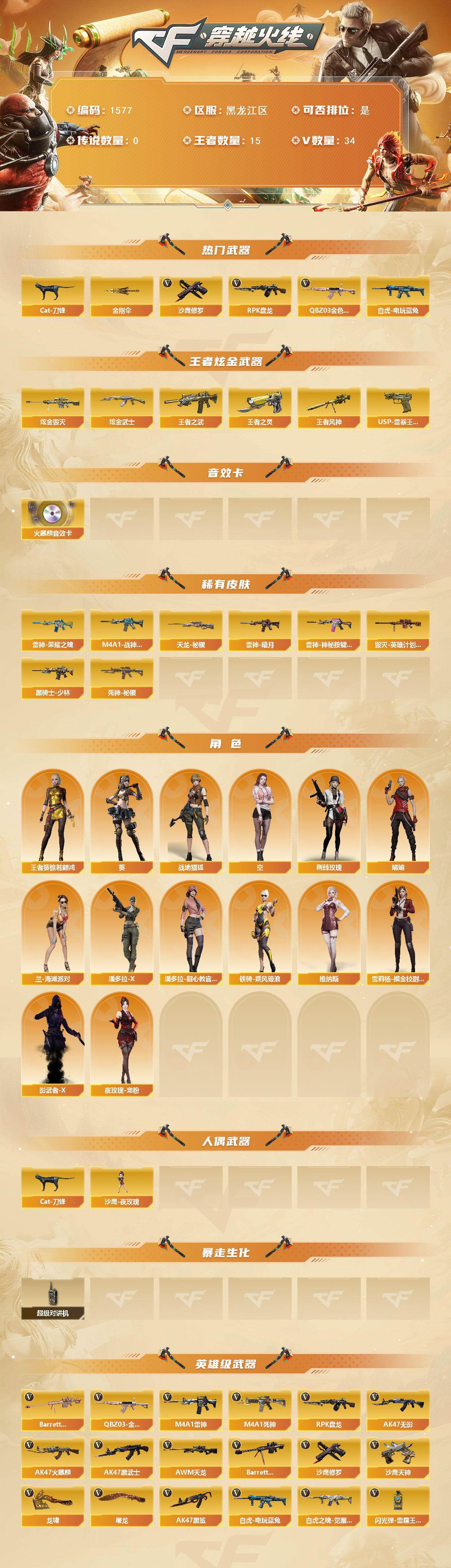 [15622456]黑龙江区-34V-15王者-2炫金 【热门武器】:QBZ03-金色蔷薇,白虎-电玩蓝兔,Cat-刀锋,RPK-盘龙,沙鹰-修罗,金刚伞 【王者炫金武器】:王者之武,王者风神,王者之灵,USP-雷暴王者,炫金武士,炫金毁灭 【音效卡】:AK47-火麒麟音效卡 【皮肤】:雷神-暗月,雷神-荣耀之魄,M4A1-战神赵云,雷神-神秘按键 皮肤,毁灭-英雄计划 皮肤,黑骑士-少林,死神-秘银,天龙-秘银 【角色】:葵,战地猎狐,王者葵-惊若翩鸿,空,荆棘玫瑰,娟娟,兰-海滩派对,潘多拉-X,潘多拉-甜心教官,铁骑-乘风破浪,维纳斯,雪莉杨-摸金校尉,夜玫瑰-宠粉,影武者-X 【人偶武器】:Cat-刀锋,沙鹰-夜玫瑰 【暴走生化】:超级对讲机 【英雄级武器】:AK47-火麒麟*2,M4A1-雷神,AK47-无影,M4A1-死神,AK47-黑武士*2,AK47-黑鲨*2,QBZ03-金色蔷薇,白虎-电玩蓝兔,白虎之魄-觉醒版,AWM-天龙,Barrett-毁灭*2,Barrett-金色蔷薇,RPK-盘龙,沙鹰-修罗,沙鹰-天神*2,屠龙*3,龙啸*2,闪光弹-雷霆王者-觉醒版 【道具】:CFS限定背包,亚洲杯纪念炫彩背包,炫彩背包,超级背包,女皇终结者-魔龙之吻,救世主-黑桃战神,绿色巨人,灵魂忍者,迷雾幽灵,夺命之镰*2,防化服*3,金色流光-枪王排位*2,星辰流光-枪王排位,枪王排位28赛季金色流光,云海游龙表情,C4-黑曜,防弹头盔*4,防弹衣*4,C4工具钳*4,手雷包*4 【特殊枪械】:1盘龙