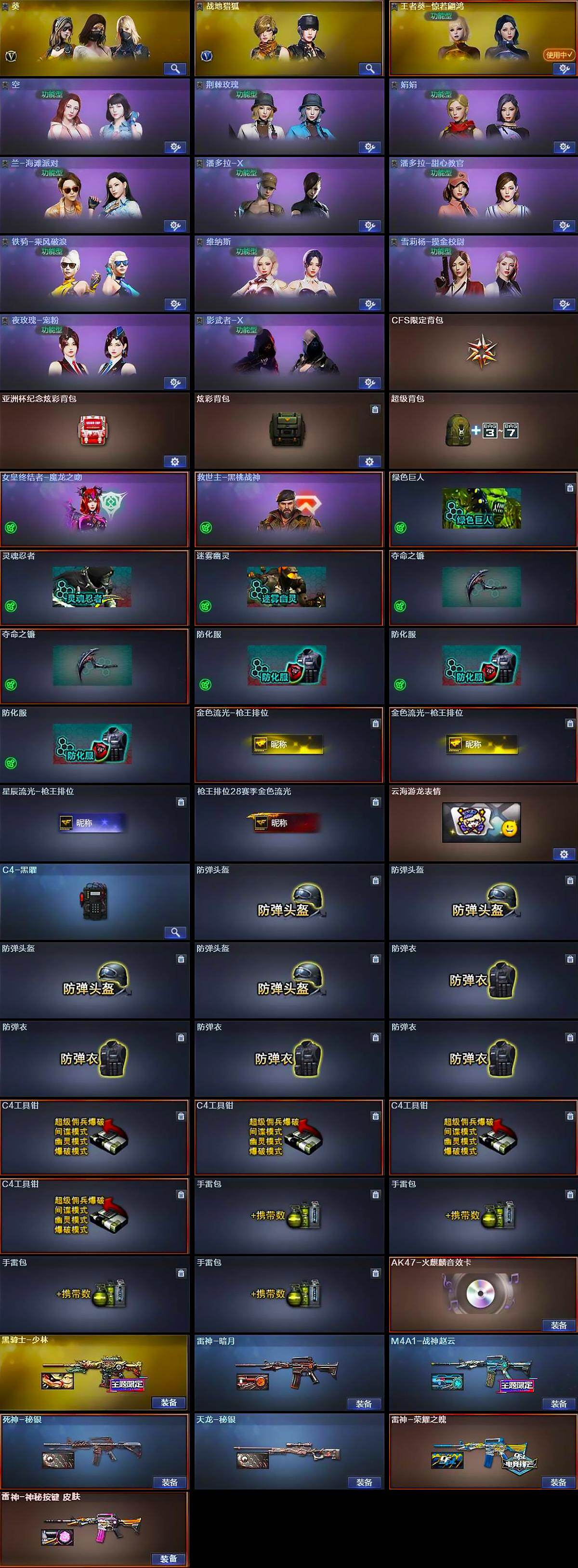 【道具】:CFS限定背包,亚洲杯纪念炫彩背包,炫彩背包,超级背包,女皇终结者-魔龙之吻,救世主-黑桃战神,绿色巨人,灵魂忍者,迷雾幽灵,夺命之镰*2,防化服*3,金色流光-枪王排位*2,星辰流光-枪王排位,枪王排位28赛季金色流光,云海游龙表情,C4-黑曜,防弹头盔*4,防弹衣*4,C4工具钳*4,手雷包*4