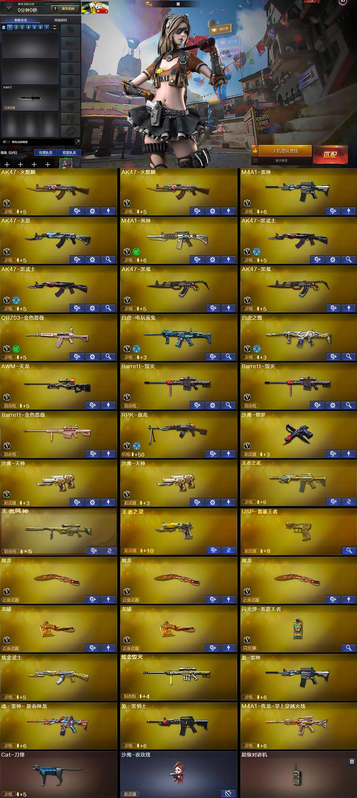【英雄级武器】:AK47-火麒麟*2,M4A1-雷神,AK47-无影,M4A1-死神,AK47-黑武士*2,AK47-黑鲨*2,QBZ03-金色蔷薇,白虎-电玩蓝兔,白虎之魄-觉醒版,AWM-天龙,Barrett-毁灭*2,Barrett-金色蔷薇,RPK-盘龙,沙鹰-修罗,沙鹰-天神*2,屠龙*3,龙啸*2,闪光弹-雷霆王者-觉醒版