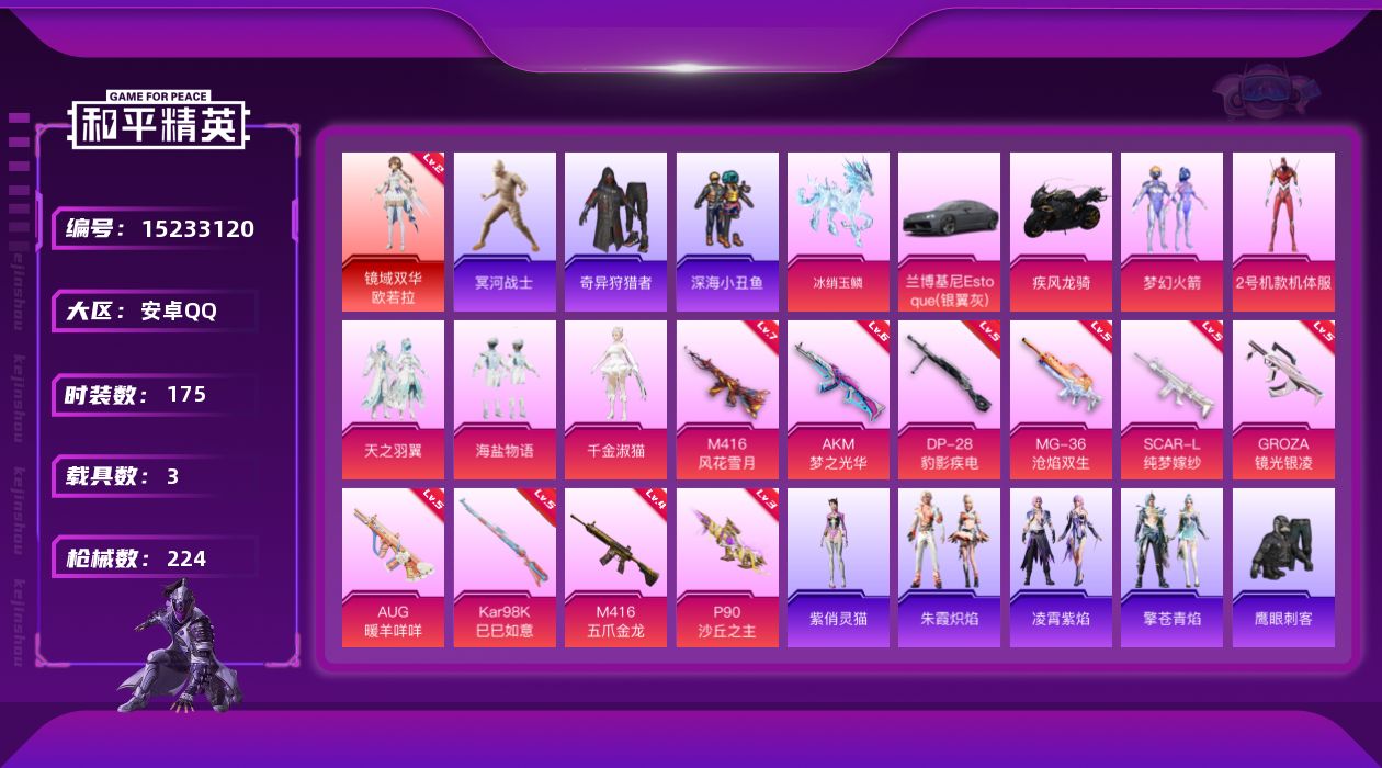 - [15238745]【店主推荐捡漏号!可直接换绑】安卓 手Q-3粉装-5特效枪-4载具-2粉色飞行器-62423热力值-12王牌印记-147套装-212枪皮【热门品类】:套装-浪漫天命,套装-小丑鱼,套装-龟仙人,套装-粉红小猪【粉色套装】:粉装-朗月武圣,角色-烟云彩露,粉装-星穹咏叹调【粉色枪皮等级】:AKM-绿萝繁花(五级),M762-青锋波束(五级),Kar98K-创世·救赎(六级),Kar98K-巳巳如意(五级),DP-28-豹影疾电(五级)【粉色载具】:兰博基尼Estoque(银翼灰),保时捷911 敞篷版(星珀红),保时捷Panamera(星辰紫),保时捷918 Spyder(液态银)【粉色枪皮】:AKM-绿萝繁花,M762-青锋波束,Kar98K-创世·救赎,Kar98K-巳巳如意,DP-28-豹影疾电【粉色飞行器】:齐天大圣飞行器