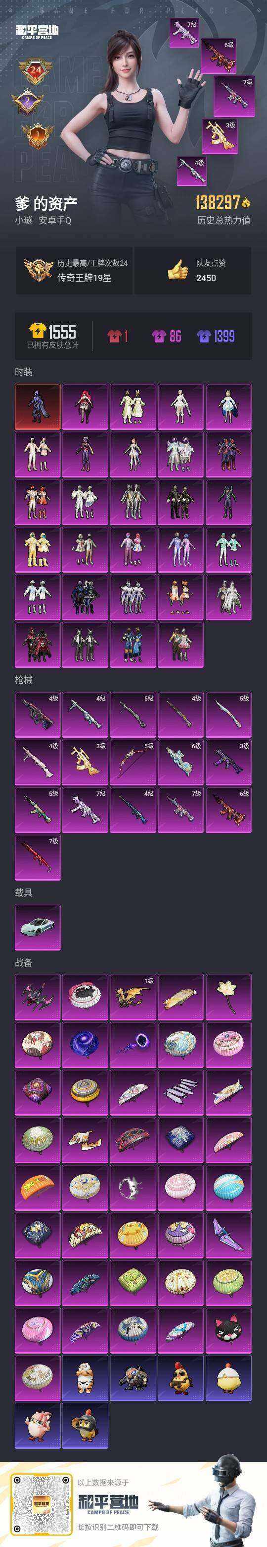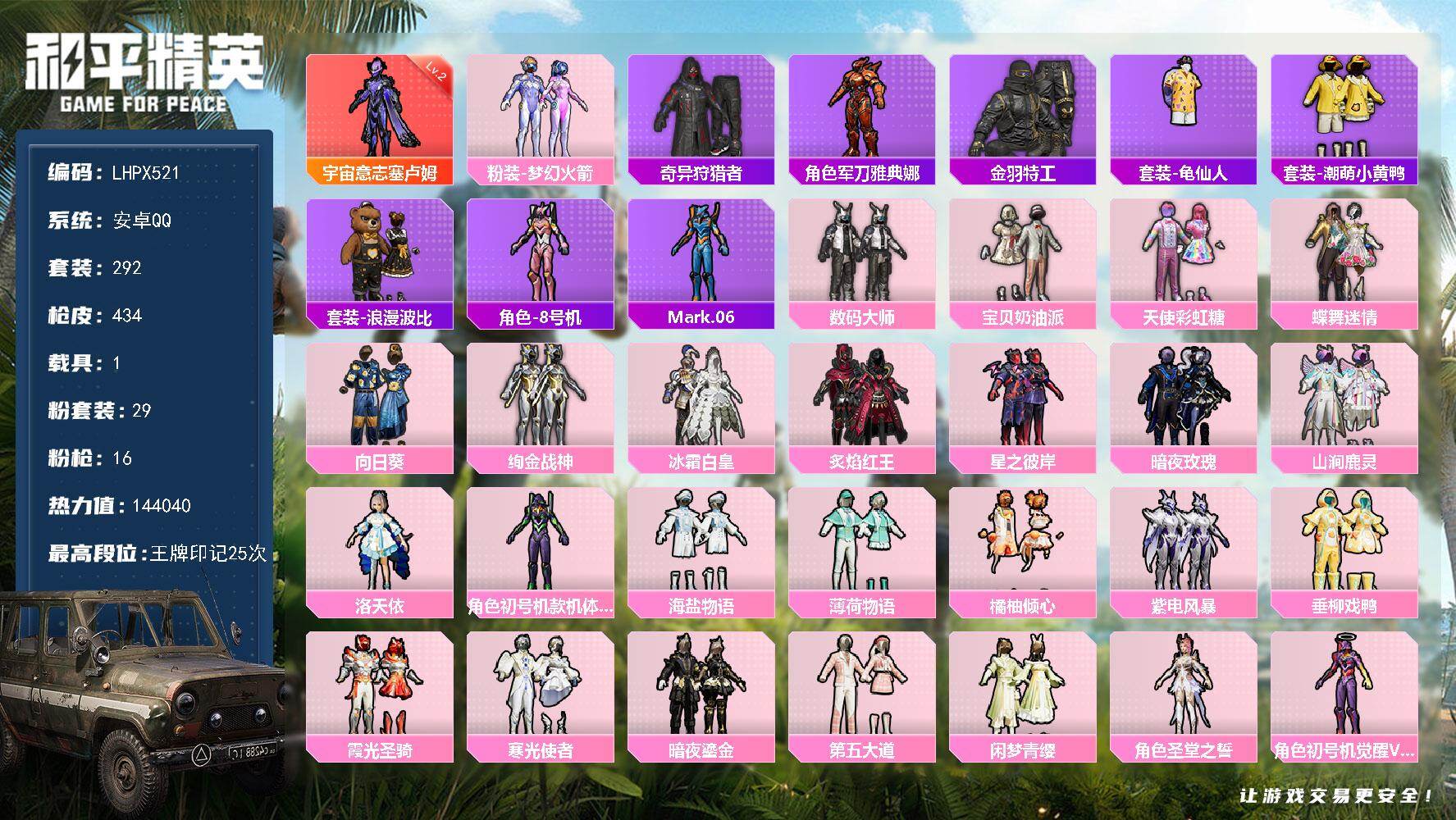 [15622338]【店主推荐捡漏号!可直接换绑】安卓 手Q-1神装-29粉装-16特效枪-1载具-9粉色飞行器-144040热力值-25王牌印记-292套装-434枪皮