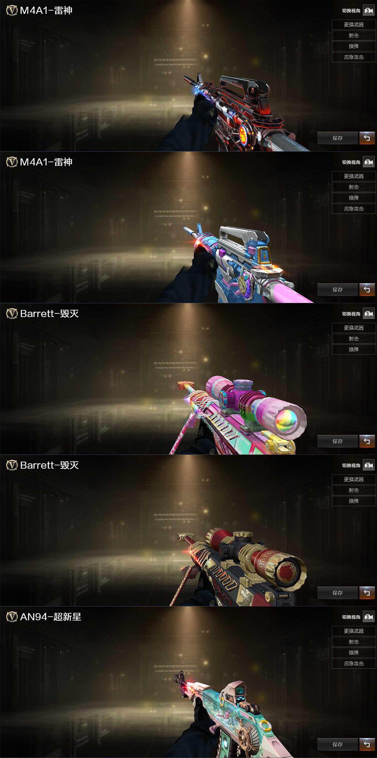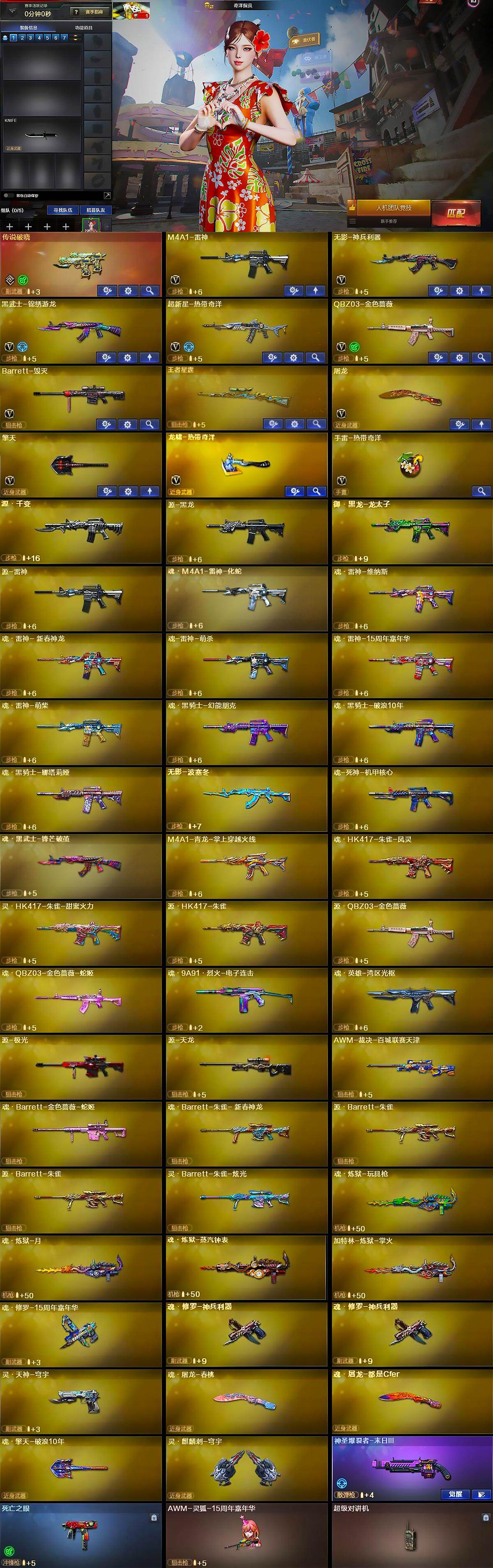 【英雄级武器】:M4A1-雷神,无影-神兵利器,黑武士-锦绣游龙,超新星-热带奇洋,QBZ03-金色蔷薇,Barrett-毁灭,屠龙,擎天,龙啸-热带奇洋,手雷-热带奇洋