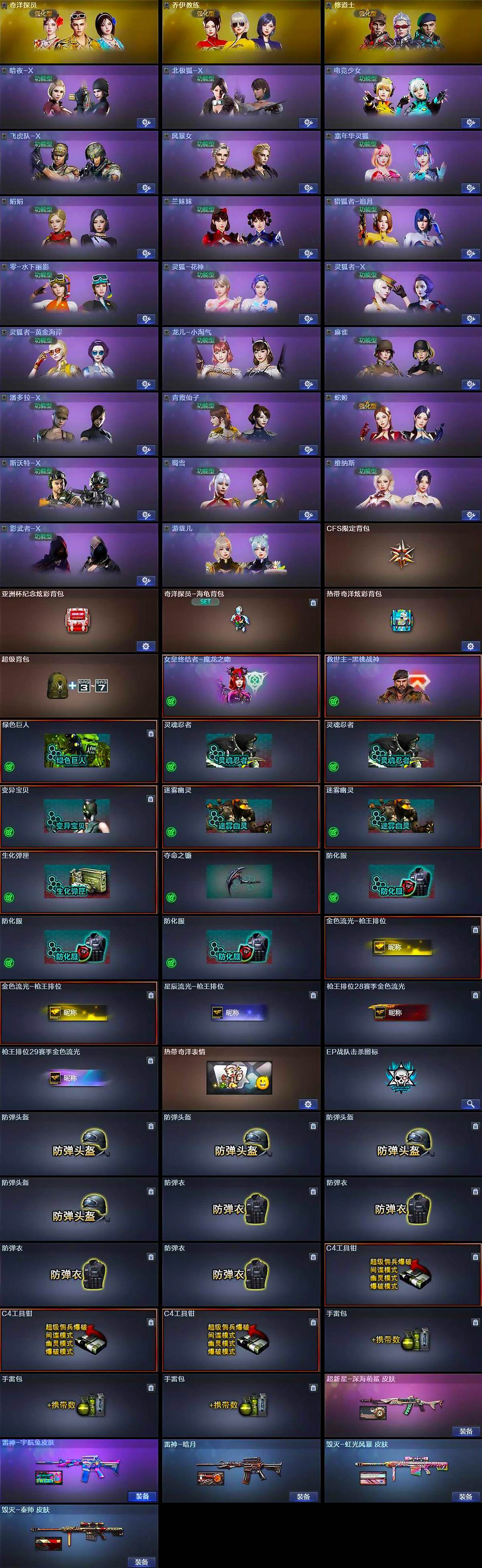 【道具】:CFS限定背包,亚洲杯纪念炫彩背包,奇洋探员-海龟背包,热带奇洋炫彩背包,超级背包,女皇终结者-魔龙之吻,救世主-黑桃战神,绿色巨人,灵魂忍者*2,变异宝贝,迷雾幽灵*2,生化弹匣,夺命之镰,防化服*3,金色流光-枪王排位*2,星辰流光-枪王排位,枪王排位28赛季金色流光,枪王排位29赛季金色流光,热带奇洋表情,EP战队击杀图标,防弹头盔*4,防弹衣*4,C4工具钳*3,手雷包*3