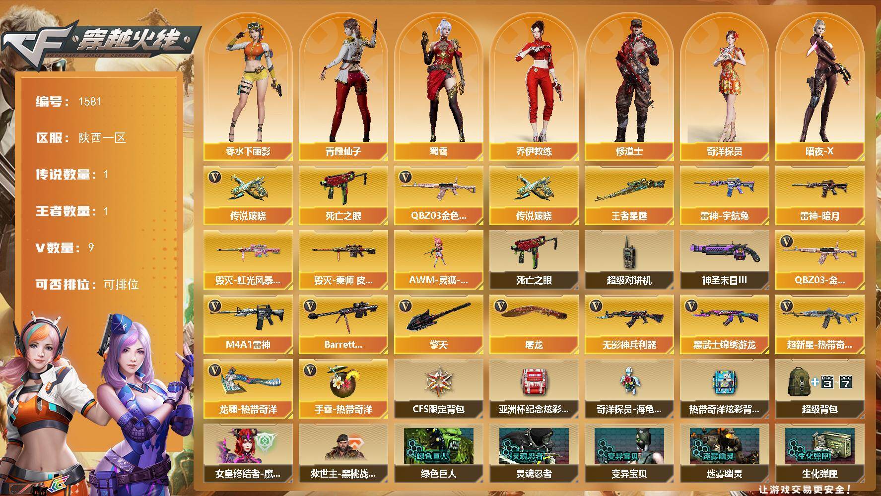[15622846]陕西一区-9V-1王者-0炫金 【传说武器】:传说破晓 【热门武器】:传说破晓,QBZ03-金色蔷薇,死亡之眼 【王者炫金武器】:王者星霆 【皮肤】:雷神-暗月,雷神-宇航兔皮肤,毁灭-虹光风暴 皮肤,毁灭-秦师 皮肤,超新星-深海萌鲨 皮肤 【角色】:奇洋探员,乔伊教练,修道士,暗夜-X,北极狐-X,电竞少女,飞虎队-X,风暴女,嘉年华灵狐,娟娟,兰妹妹,猎狐者-追月,0号玩家,零-水下丽影,灵狐-花神,灵狐者-X,灵狐者-黄金海岸,龙儿-小淘气,麻雀,潘多拉-X,青霞仙子,蛇姬,斯沃特-X,蜀雪,兔囡囡,维纳斯,影武者-X,游珑儿 【人偶武器】:AWM-灵狐-15周年嘉年华 【暴走生化】:死亡之眼,超级对讲机 【挑战大师】:神圣爆裂者-末日III 【英雄级武器】:M4A1-雷神,无影-神兵利器,黑武士-锦绣游龙,超新星-热带奇洋,QBZ03-金色蔷薇,Barrett-毁灭,屠龙,擎天,龙啸-热带奇洋,手雷-热带奇洋 【道具】:CFS限定背包,亚洲杯纪念炫彩背包,奇洋探员-海龟背包,热带奇洋炫彩背包,超级背包,女皇终结者-魔龙之吻,救世主-黑桃战神,绿色巨人,灵魂忍者*2,变异宝贝,迷雾幽灵*2,生化弹匣,夺命之镰,防化服*3,金色流光-枪王排位*2,星辰流光-枪王排位,枪王排位28赛季金色流光,枪王排位29赛季金色流光,热带奇洋表情,EP战队击杀图标,防弹头盔*4,防弹衣*4,C4工具钳*3,手雷包*3 【特殊枪械】:
