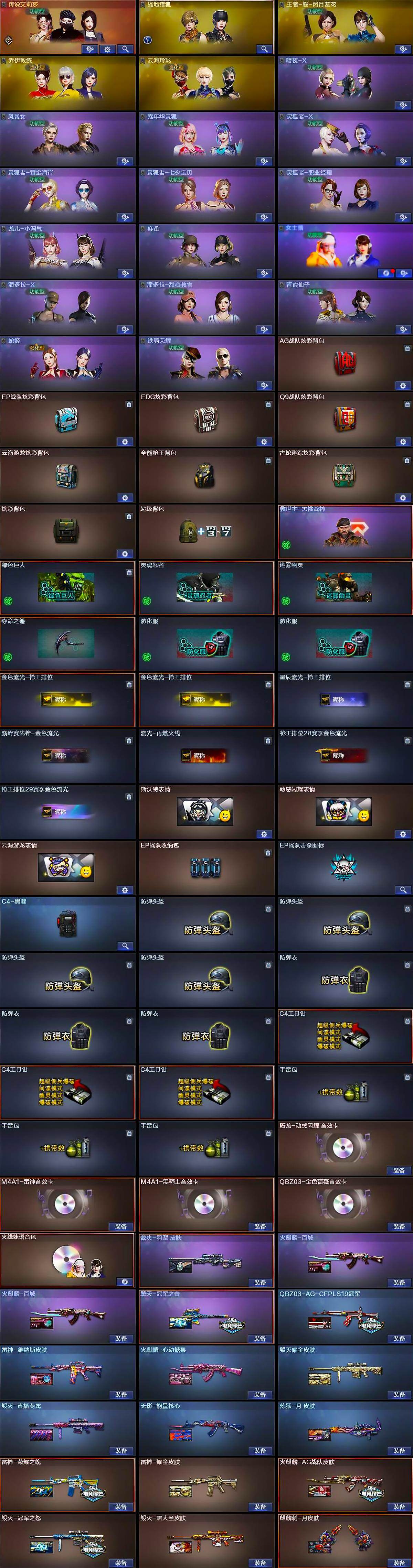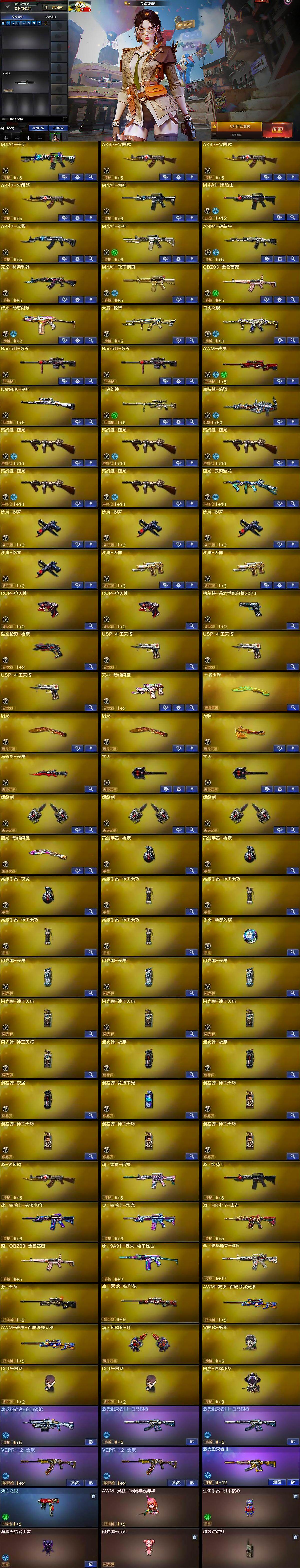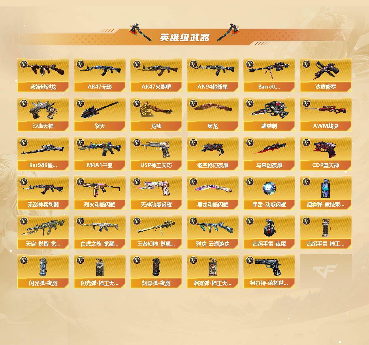【英雄级武器】:M4A1-千变,AK47-火麒麟*3,M4A1-雷神,M4A1-黑骑士,AK47-无影,M4A1-死神,AN94-超新星,无影-神兵利器,M4A1-玫瑰精灵,QBZ03-金色蔷薇,烈火-动感闪耀,天启-悦智-觉醒版,白虎之魄-觉醒版,Barrett-毁灭*2,AWM-裁决,Kar98K-星神,王者幻神-觉醒版,加特林-炼狱,汤姆逊-烈龙*5,烈龙-云海游龙,沙鹰-修罗*4,沙鹰-天神*2,COP-堕天神*2,柯尔特-荣耀世冠白鲨2023,破空枪刃-夜魔,USP-神工天巧*3,天神-动感闪耀,屠龙*2,龙啸,马来剑-夜魔,擎天*2,麒麟刺*3,屠龙-动感闪耀,高爆手雷-夜魔*3,高爆手雷-神工天巧*4,手雷-动感闪耀,闪光弹-夜魔*3,闪光弹-神工天巧*4,烟雾弹-夜魔*3,烟雾弹-竞技荣光,烟雾弹-神工天巧*4