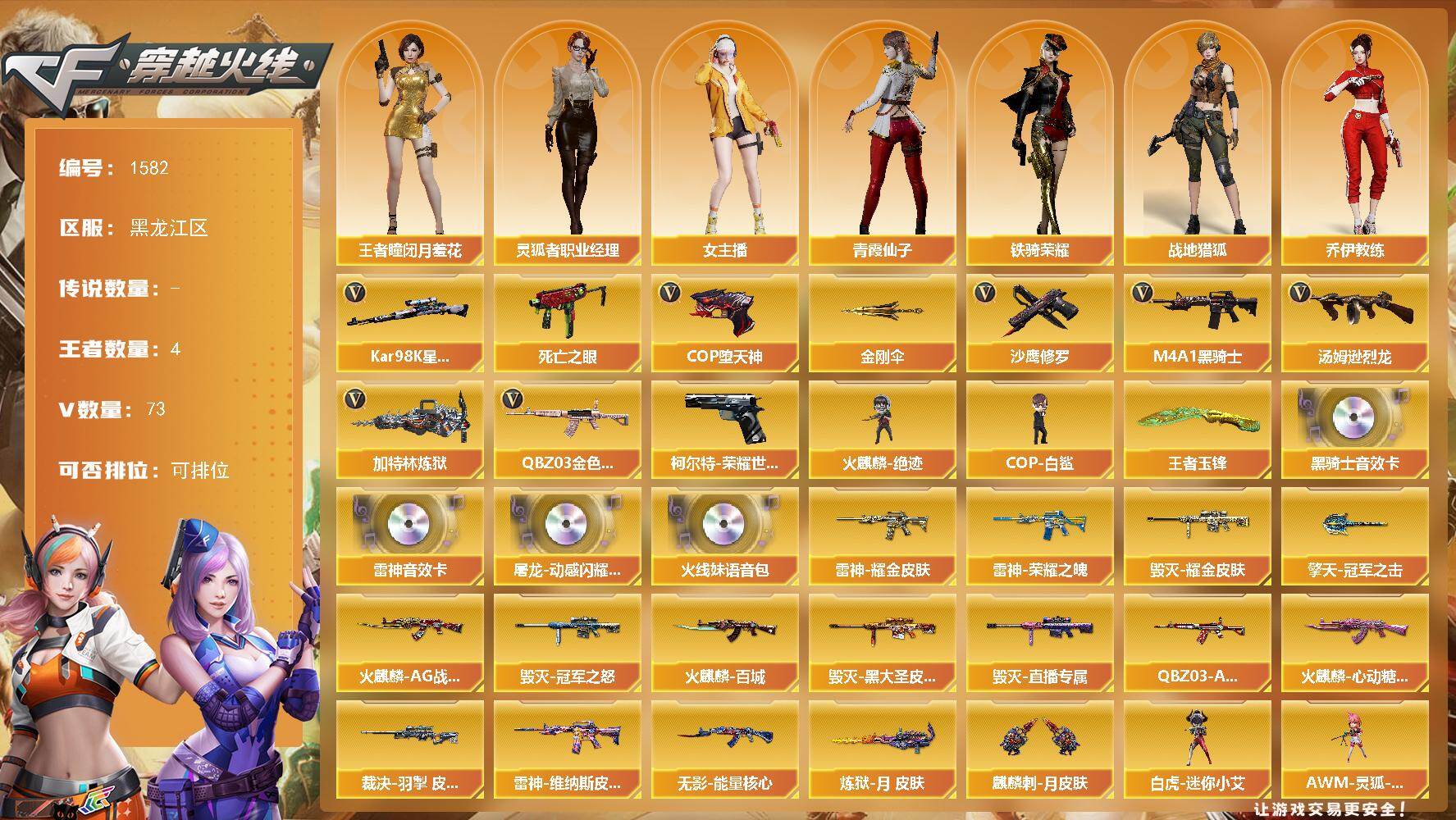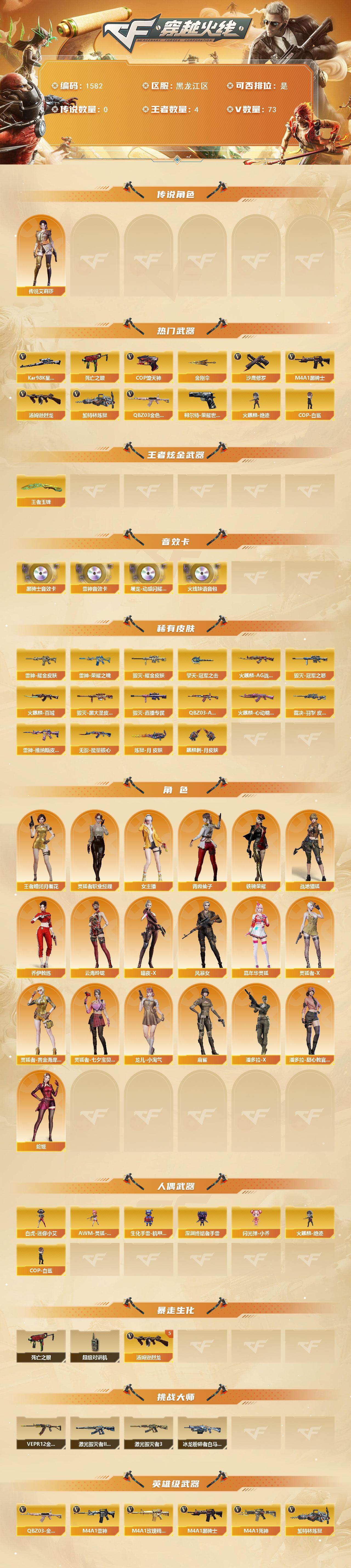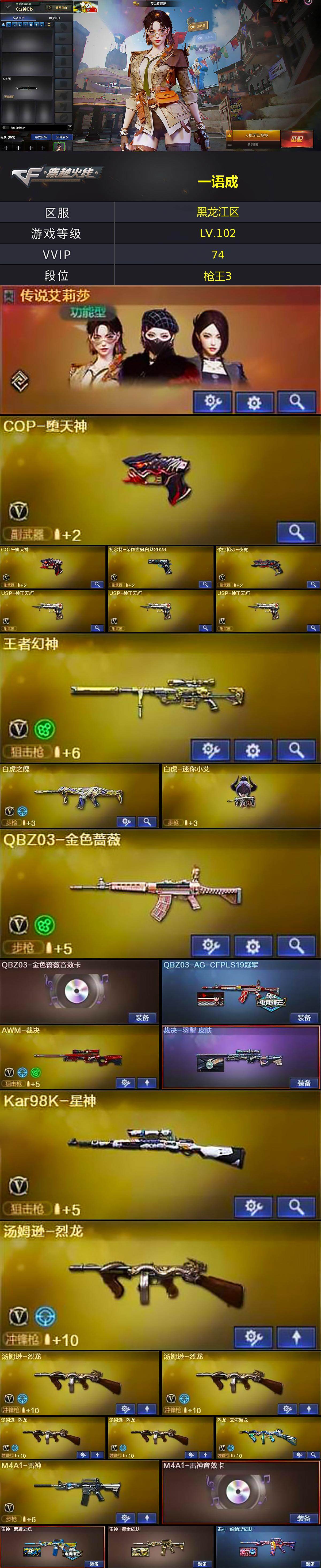 [15623070]黑龙江区-73V-4王者-0炫金 【传说角色】:传说艾莉莎 【热门武器】:QBZ03-金色蔷薇,柯尔特-荣耀世冠白鲨2023,死亡之眼,Kar98K-星神,M4A1-黑骑士,汤姆逊-烈龙*5,加特林-炼狱,火麒麟-绝迹,COP-白鲨*2,COP-堕天神*2,沙鹰-修罗*4,金刚伞*2 【王者炫金武器】:王者玉锋 【音效卡】:屠龙-动感闪耀 音效卡,M4A1-雷神音效卡,M4A1-黑骑士音效卡,火线妹语音包 【皮肤】:QBZ03-AG-CFPLS19冠军,裁决-羽掣 皮肤,雷神-荣耀之魄,雷神-耀金皮肤,雷神-维纳斯皮肤,火麒麟-AG战队皮肤,火麒麟-百城*2,火麒麟-心动糖果,毁灭耀金皮肤,毁灭-冠军之怒,毁灭-黑大圣皮肤,毁灭-直播专属,无影-能量核心,炼狱-月 皮肤,擎天-冠军之击,麒麟刺-月皮肤 【角色】:战地猎狐,王者-瞳-闭月羞花,乔伊教练,云海玲珑,暗夜-X,风暴女,嘉年华灵狐,灵狐者-X,灵狐者-黄金海岸,灵狐者-七夕宝贝,灵狐者-职业经理,龙儿-小淘气,麻雀,女主播,潘多拉-X,潘多拉-甜心教官,青霞仙子,蛇姬,铁骑荣耀 【人偶武器】:火麒麟-绝迹,COP-白鲨*2,白虎-迷你小艾,AWM-灵狐-15周年嘉年华,生化手雷-机甲核心,深渊终结者手雷,闪光弹-小乔 【暴走生化】:死亡之眼,超级对讲机 【挑战大师】:冰龙粉碎者-白马银枪,激光毁灭者III-白马银枪*2,VEPR-12-金魔*2,激光毁灭者III 【英雄级武器】:M4A1-千变,AK47-火麒麟*3,M4A1-雷神,M4A1-黑骑士,AK47-无影,M4A1-死神,AN94-超新星,无影-神兵利器,M4A1-玫瑰精灵,QBZ03-金色蔷薇,烈火-动感闪耀,天启-悦智-觉醒版,白虎之魄-觉醒版,Barrett-毁灭*2,AWM-裁决,Kar98K-星神,王者幻神-觉醒版,加特林-炼狱,汤姆逊-烈龙*5,烈龙-云海游龙,沙鹰-修罗*4,沙鹰-天神*2,COP-堕天神*2,柯尔特-荣耀世冠白鲨2023,破空枪刃-夜魔,USP-神工天巧*3,天神-动感闪耀,屠龙*2,龙啸,马来剑-夜魔,擎天*2,麒麟刺*3,屠龙-动感闪耀,高爆手雷-夜魔*3,高爆手雷-神工天巧*4,手雷-动感闪耀,闪光弹-夜魔*3,闪光弹-神工天巧*4,烟雾弹-夜魔*3,烟雾弹-竞技荣光,烟雾弹-神工天巧*4 【道具】:AG战队