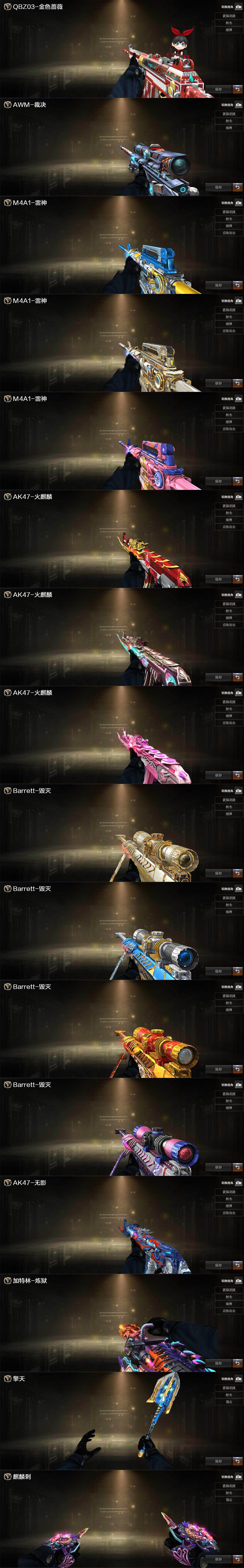 【皮肤】:QBZ03-AG-CFPLS19冠军,裁决-羽掣 皮肤,雷神-荣耀之魄,雷神-耀金皮肤,雷神-维纳斯皮肤,火麒麟-AG战队皮肤,火麒麟-百城*2,火麒麟-心动糖果,毁灭耀金皮肤,毁灭-冠军之怒,毁灭-黑大圣皮肤,毁灭-直播专属,无影-能量核心,炼狱-月 皮肤,擎天-冠军之击,麒麟刺-月皮肤