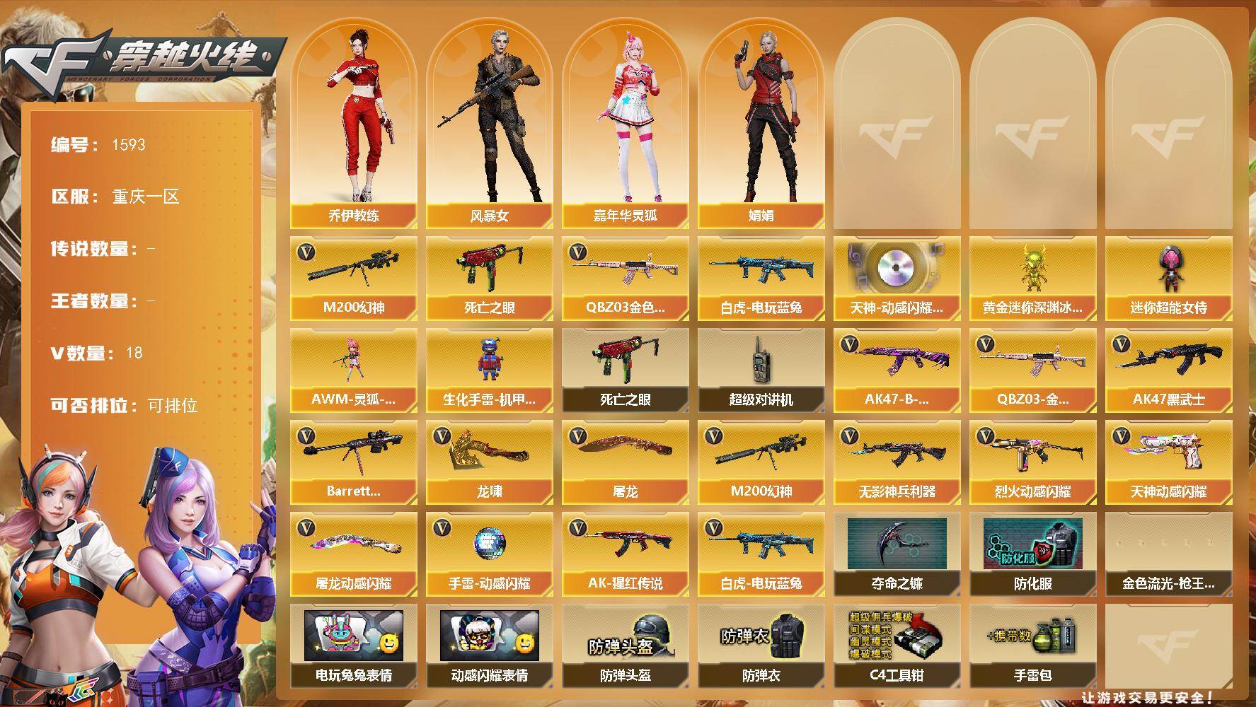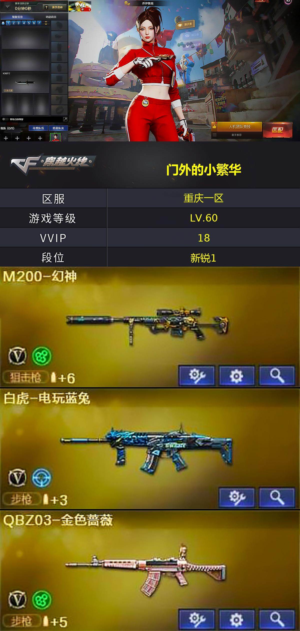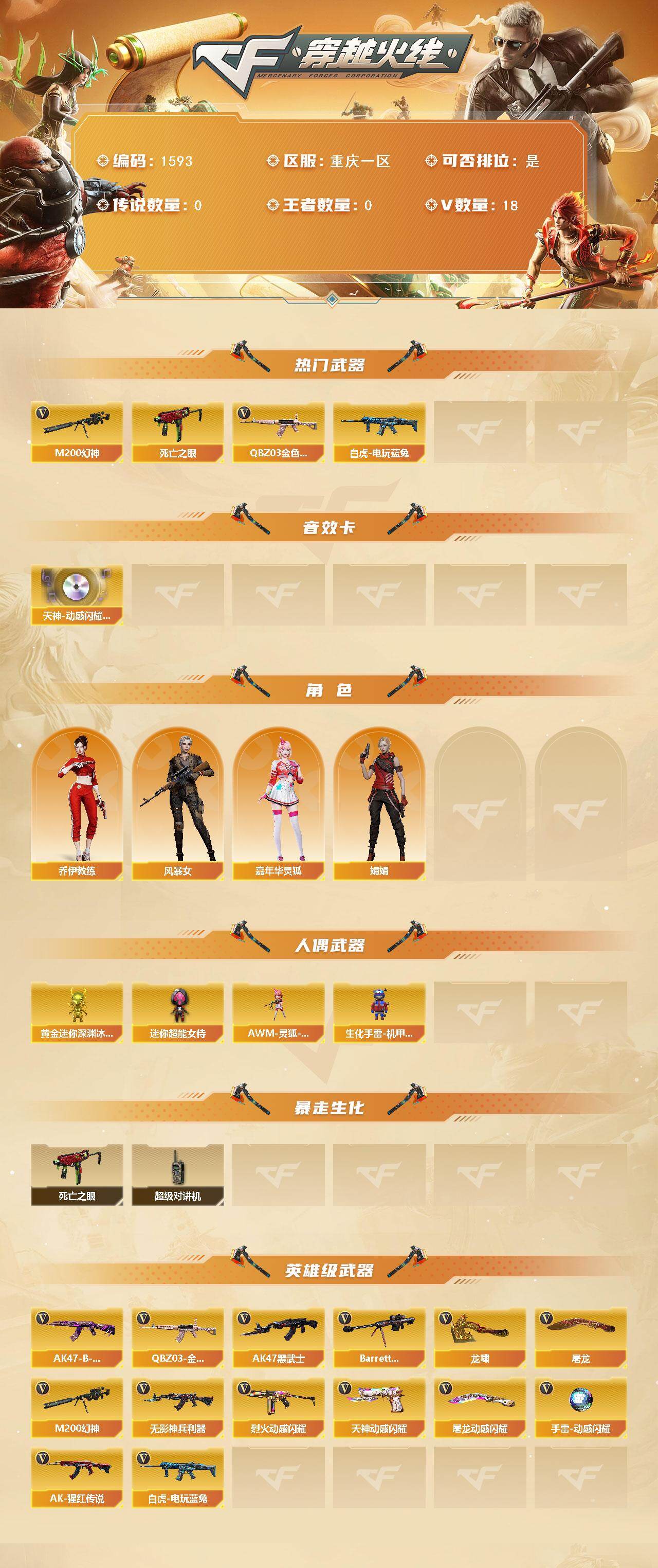 [15623775]重庆一区-18V-0王者-0炫金 【热门武器】:QBZ03-金色蔷薇,M200-幻神,死亡之眼,白虎-电玩蓝兔 【音效卡】:天神-动感闪耀 音效卡 【角色】:乔伊教练,风暴女,嘉年华灵狐,娟娟 【人偶武器】:AWM-灵狐-15周年嘉年华,黄金迷你深渊冰龙,生化手雷-机甲核心,迷你超能女侍 【暴走生化】:死亡之眼,超级对讲机 【英雄级武器】:AK47-黑武士,无影-神兵利器,QBZ03-金色蔷薇,烈火-动感闪耀,AK-47-猩红传说,AK47-B-常胜将军,白虎-电玩蓝兔,Barrett-毁灭,M200-幻神,天神-动感闪耀,屠龙,龙啸,屠龙-动感闪耀,手雷-动感闪耀 【道具】:夺命之镰,防化服,金色流光-枪王排位*2,电玩兔兔表情,动感闪耀表情,防弹头盔,防弹衣,C4工具钳,手雷包 【特殊枪械】:
