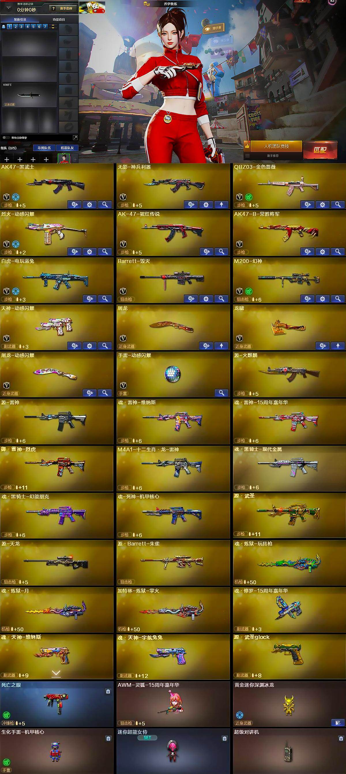 - [12943464]湖南一区-82V-5王者-0炫金 【热门武器】:QBZ03-金色蔷薇,死亡之眼,金色小号,C.A.T,Cat-刀锋,M4A1-黑骑士*3,汤姆逊-烈龙*9,RPK-盘龙,加特林-炼狱*4,沙鹰-修罗*6 【王者炫金武器】:超新星-悦享*2,天启-悦智,王者之翼,玫瑰精灵-悦动 【稀有皮肤】:幻神-周瑜皮肤,雷神-能量核心,火麒麟-心动糖果,毁灭-黑大圣皮肤,天龙-能量核心,无影耀金皮肤,修罗-星空,屠龙-荣耀之锋 【角色】:零-水下丽影,零,葵,樱,铁骑荣耀 【人偶武器】:M4A1-刀锋,C.A.T,Cat-刀锋,迷你深渊冰龙,灵狐娃娃手雷,生化手雷-机甲核心,闪光弹-小乔 【暴走生化】:死亡之眼 【挑战大师】:神圣爆裂者III,神圣爆裂者-末日III,激光毁灭者III,AK47-冰龙粉碎者,冰龙粉碎者-白马银枪 【英雄级武器】:M4A1-武圣,QBZ03-金色蔷薇,无影-神兵利器,M4A1-雷神*2,M4A1-黑龙*2,M4A1-玫瑰精灵,M4A1-黑骑士*3,M4A1-死神,RPK-盘龙,加特林-炼狱*4,汤姆逊-烈龙*9,AK47-麒麟,AK47-无影,AK47-火麒麟*3,AK47-黑武士,AK12-天启,AN94-超新星,AWM-天龙*4,Barrett-毁灭*2,Barrett-极光,AK47-机械迷城,QBZ03-天罚,AK47-黑鲨*2,M4A1-千变,AK-47-猩红传说*6,AK47-B-战神,沙鹰-天神*6,沙鹰-修罗*6,麒麟刺*2,擎天*2,龙啸,屠龙*7 【特殊枪械】:3黑骑士,6烈龙,1盘龙,4炼狱
