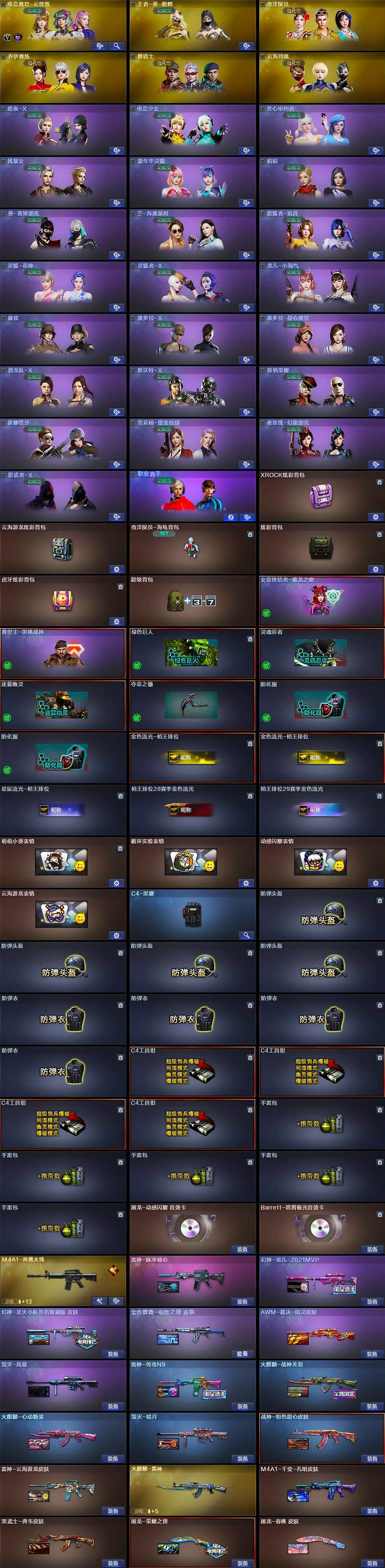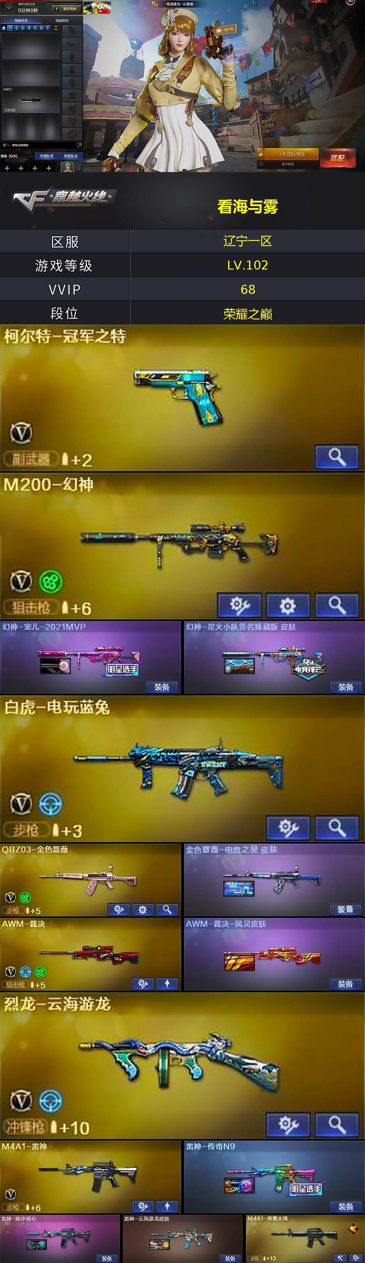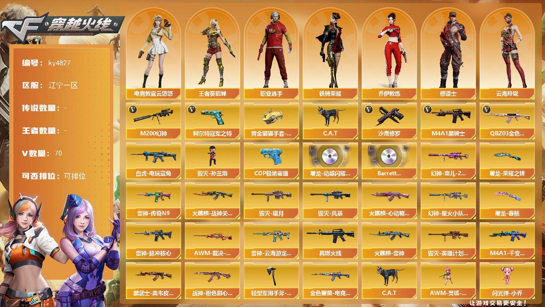 [15623862]辽宁一区-70V-0王者-0炫金 【热门武器】:QBZ03-金色蔷薇,M200-幻神,白虎-电玩蓝兔,柯尔特-冠军之特,C.A.T,M4A1-黑骑士,毁灭-孙三炮,沙鹰-修罗*3,黄金猫猫手套-白鲨,COP 357-极地霜雄 【音效卡】:屠龙-动感闪耀 音效卡,Barrett-碧霄极光音效卡 【皮肤】:幻神-宠儿-2021MVP,幻神-星火小队签名臻藏版 皮肤,金色蔷薇-电竞之星 皮肤,AWM-裁决-凤灵皮肤,雷神-传奇N9,雷神-脉冲核心,雷神-云海游龙皮肤,M4A1-再燃火线,火麒麟-雷神,火麒麟-战神关羽,火麒麟-心动糖果,毁灭-暗月,毁灭-风暴,毁灭-英雄计划 皮肤,M4A1-千变-孔明皮肤,黑武士-典韦皮肤,战神-粉色甜心皮肤,屠龙-荣耀之锋,屠龙-春桃 皮肤,轻型军用手斧-再燃火线 【角色】:电竞教官-云悠悠,王者-葵-貂蝉,奇洋探员,乔伊教练,修道士,云海玲珑,暗夜-X,电竞少女,芳心审判者,风暴女,嘉年华灵狐,娟娟,葵-赛博朋克,兰-海滩派对,猎狐者-追月,灵狐-花神,灵狐者-X,龙儿-小淘气,麻雀,潘多拉-X,潘多拉-甜心教官,潜龙队-X,斯沃特-X,铁骑荣耀,新娜塔莎,雪莉杨-摸金校尉,夜玫瑰-幻能朋克,影武者-X,职业选手 【人偶武器】:毁灭-孙三炮,AWM-灵狐-15周年嘉年华,C.A.T,闪光弹-小乔 【暴走生化】:超级对讲机 【挑战大师】:神圣爆裂者III,AK47-冰龙粉碎者,冰龙粉碎者-白马银枪,激光毁灭者III*4 【英雄级武器】:AK47-火麒麟*2,M4A1-雷神,M4A1-黑骑士,AK47-黑武士,无影-神兵利器,黑武士-锦绣游龙,M4A1-玫瑰精灵,QBZ03-金色蔷薇,烈火-动感闪耀,AK-47-猩红传说*4,AK47-B-战神,白虎-电玩蓝兔,Barrett-毁灭,AWM-裁决,M200-幻神,烈龙-云海游龙,沙鹰-修罗*3,沙鹰-天神*2,柯尔特-冠军之特,天神-动感闪耀,屠龙,龙啸,擎天-竞技荣光,屠龙-动感闪耀,擎天-云海游龙,麒麟刺-百战金芒,高爆手雷-幻灵*2,高爆手雷-竞技荣光*5,手雷-动感闪耀,手雷-云海游龙,手雷-热带奇洋,闪光弹-幻灵*2,闪光弹-竞技荣光*5,烟雾弹-幻灵*2,烟雾弹-竞技荣光*5,M4A1-赤狱骑士 【道具】:XROCK炫彩背包,云海游龙炫彩背包,奇洋探员-海龟背包,炫彩背包,虎