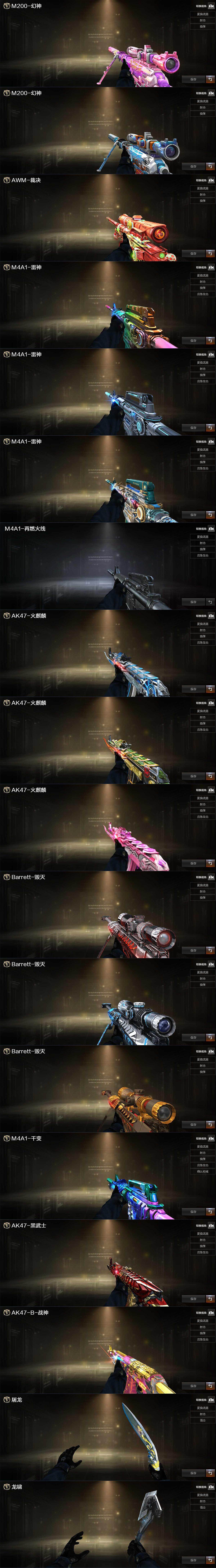 【英雄级武器】:AK47-火麒麟*2,M4A1-雷神,M4A1-黑骑士,AK47-黑武士,无影-神兵利器,黑武士-锦绣游龙,M4A1-玫瑰精灵,QBZ03-金色蔷薇,烈火-动感闪耀,AK-47-猩红传说*4,AK47-B-战神,白虎-电玩蓝兔,Barrett-毁灭,AWM-裁决,M200-幻神,烈龙-云海游龙,沙鹰-修罗*3,沙鹰-天神*2,柯尔特-冠军之特,天神-动感闪耀,屠龙,龙啸,擎天-竞技荣光,屠龙-动感闪耀,擎天-云海游龙,麒麟刺-百战金芒,高爆手雷-幻灵*2,高爆手雷-竞技荣光*5,手雷-动感闪耀,手雷-云海游龙,手雷-热带奇洋,闪光弹-幻灵*2,闪光弹-竞技荣光*5,烟雾弹-幻灵*2,烟雾弹-竞技荣光*5,M4A1-赤狱骑士