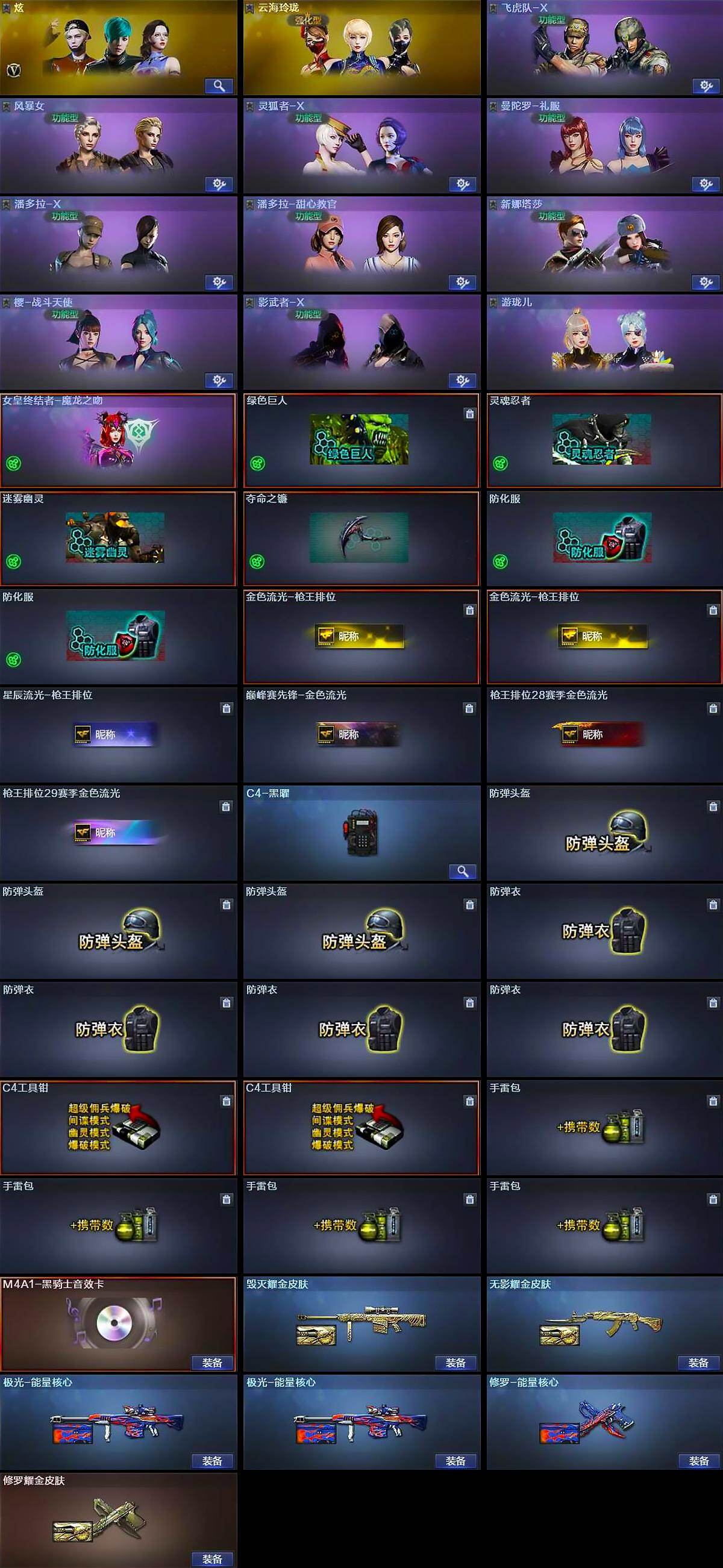 【道具】:女皇终结者-魔龙之吻,绿色巨人,灵魂忍者,迷雾幽灵,夺命之镰,防化服*2,金色流光-枪王排位*2,星辰流光-枪王排位,巅峰赛先锋-金色流光,枪王排位28赛季金色流光,枪王排位29赛季金色流光,C4-黑曜,防弹头盔*3,防弹衣*4,C4工具钳*2,手雷包*4