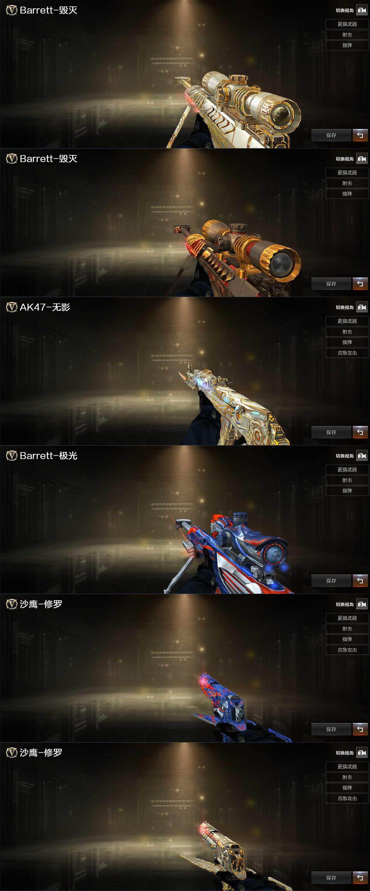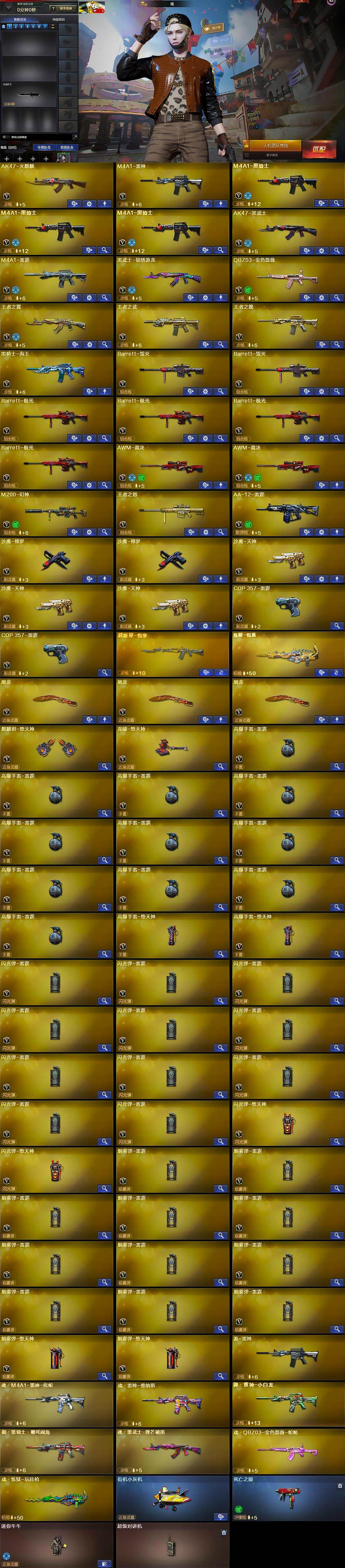 【英雄级武器】:AK47-火麒麟,M4A1-雷神,M4A1-黑骑士*3,AK47-黑武士,M4A1-雷霆,黑武士-锦绣游龙,QBZ03-金色蔷薇,王者之翼-觉醒版,王者之武-觉醒版,王者之魄-觉醒版,黑骑士-海王,Barrett-毁灭*2,Barrett-极光*4,AWM-裁决*2,M200-幻神,王者之怒-觉醒版,AA-12-雷霆,沙鹰-修罗*2,沙鹰-天神*3,COP-雷霆*2,屠龙*3,麒麟刺-堕天神,龙啸-堕天神,高爆手雷-雷霆*11,高爆手雷-堕天神*2,闪光弹-雷霆*11,闪光弹-堕天神*2,烟雾弹-雷霆*11,烟雾弹-堕天神*2