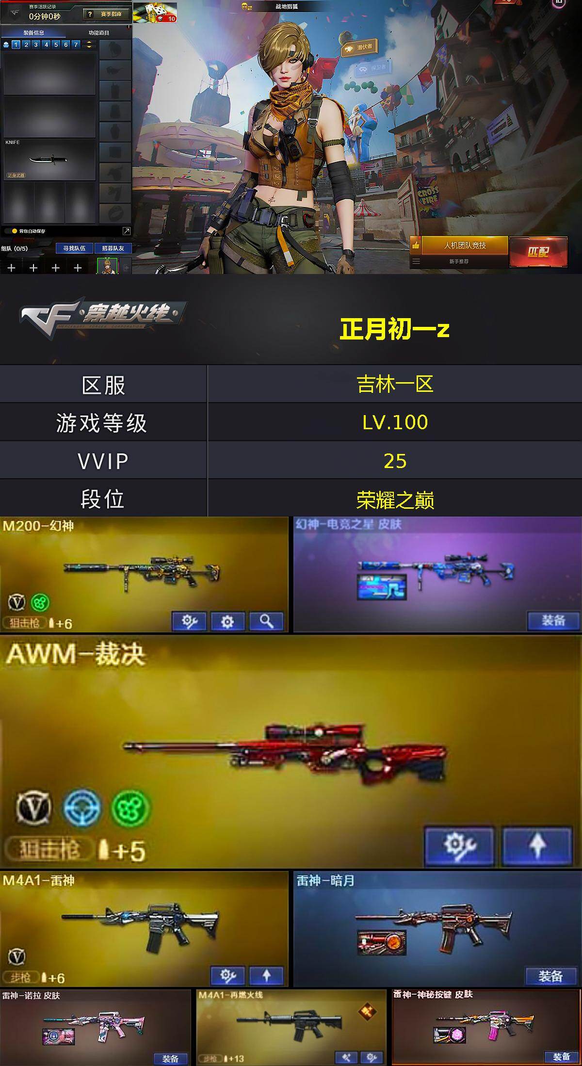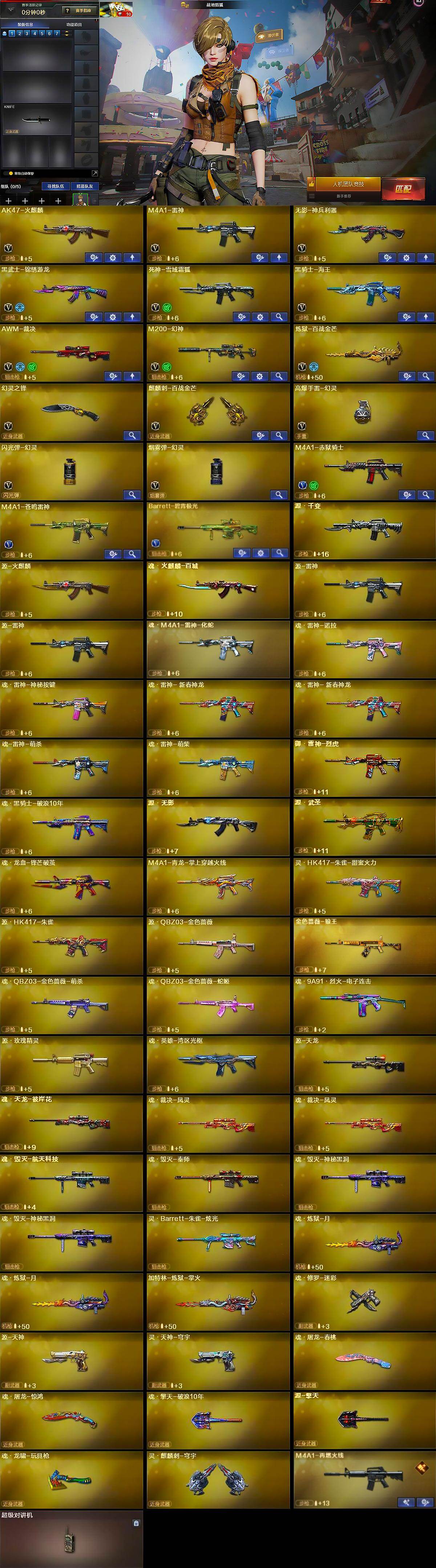 - [13035692]【45】40V/100级/元帅/1炫金/2英雄/QBZ03-金色蔷薇/死亡之眼/火麒麟-荣耀世冠/雷神-荣耀世冠/柯尔特-荣耀世冠/M4A1-黑骑士/汤姆逊-烈龙/RPK-盘龙/加特林-炼狱/沙鹰-修罗/龙啸-荣耀世冠/炫金毁灭/M4A1-雷神音效卡/AWM-裁决音效卡/雷神-虎将/雷神-耀金皮肤/雷神冠军之魄/雷神-荣耀世冠AG/火麒麟-AG战队皮肤/火麒麟-轻羽皮肤/火麒麟-荣耀世冠AG/火麒麟-百城/火麒麟-心动糖果/毁灭耀金皮肤/毁灭-黑大圣皮肤/毁灭-风暴/修罗耀金皮肤/修罗-星空/屠龙-荣耀之锋/屠龙-荣耀世冠AG/葵/魅影/蜀雪/女主播/青霞仙子/火麒麟-灵狐/AWM-灵狐-15周年嘉年华/迷你超能女侍/迷你牛魔王/迷你波特博士/夺魂/迷你火种/生化手雷-机甲核心/神圣爆裂者-末日/阐释者/荣耀世冠-火麒麟/荣耀世冠-柯尔特/荣耀世冠-龙啸/无影-神兵利器/M4A1-雷神/AK47-火麒麟/AK12-天启/AN94-超新星/Barrett-毁灭/Barrett-极光/Barrett-朱雀/AK47-黑鲨/AK-47-猩红传说/麒麟刺/擎天/屠龙