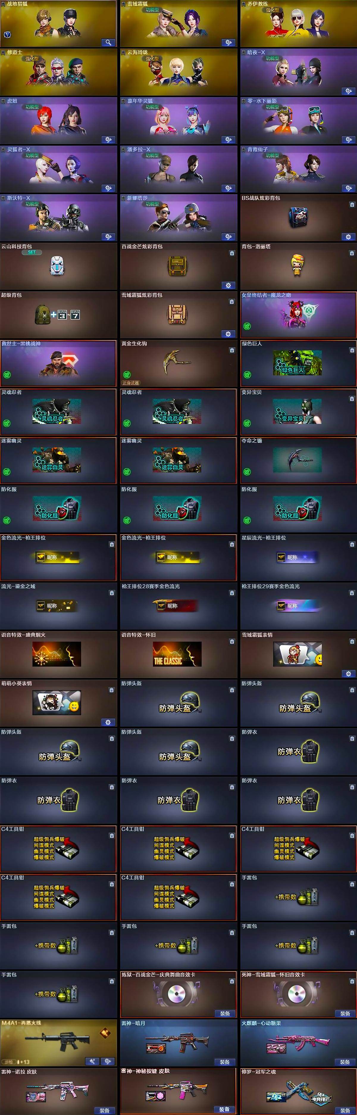 【道具】:BS战队炫彩背包,云山科技背包,百战金芒炫彩背包,背包-洛丽塔,超级背包,雪域霜狐炫彩背包,女皇终结者-魔龙之吻,救世主-黑桃战神,黄金生化钩,绿色巨人,灵魂忍者*2,变异宝贝,迷雾幽灵*2,夺命之镰,防化服*3,金色流光-枪王排位*2,星辰流光-枪王排位,流光-鎏金之域,枪王排位28赛季金色流光,枪王排位29赛季金色流光,语音特效-盛典烟火,语音特效-怀旧,雪域霜狐表情,萌萌小葵表情,防弹头盔*4,防弹衣*4,C4工具钳*5,手雷包*5