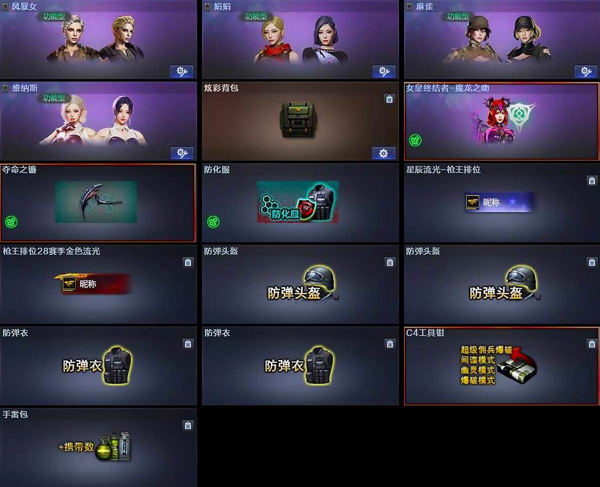 【道具】:炫彩背包,女皇终结者-魔龙之吻,夺命之镰,防化服,星辰流光-枪王排位,枪王排位28赛季金色流光,防弹头盔*2,防弹衣*2,C4工具钳,手雷包
