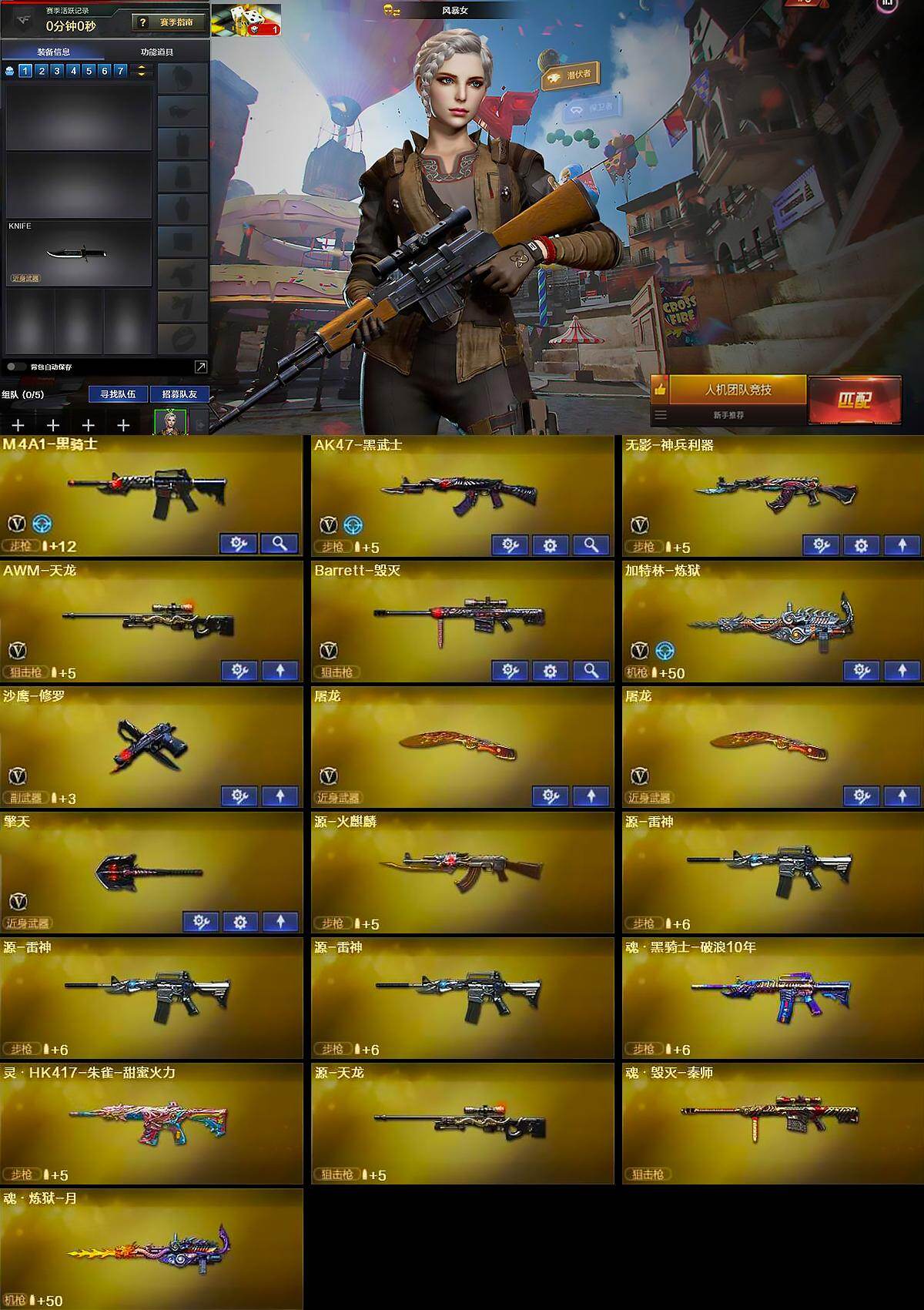 【英雄级武器】:M4A1-黑骑士,AK47-黑武士,无影-神兵利器,AWM-天龙,Barrett-毁灭,加特林-炼狱,沙鹰-修罗,屠龙*2,擎天