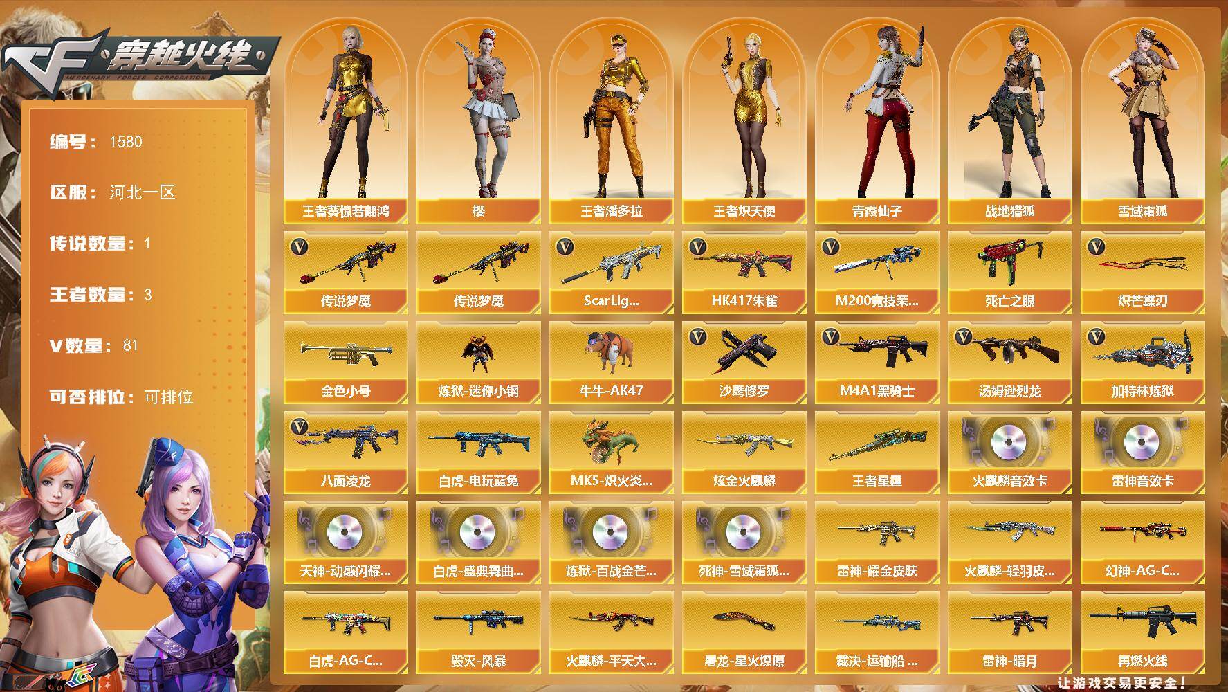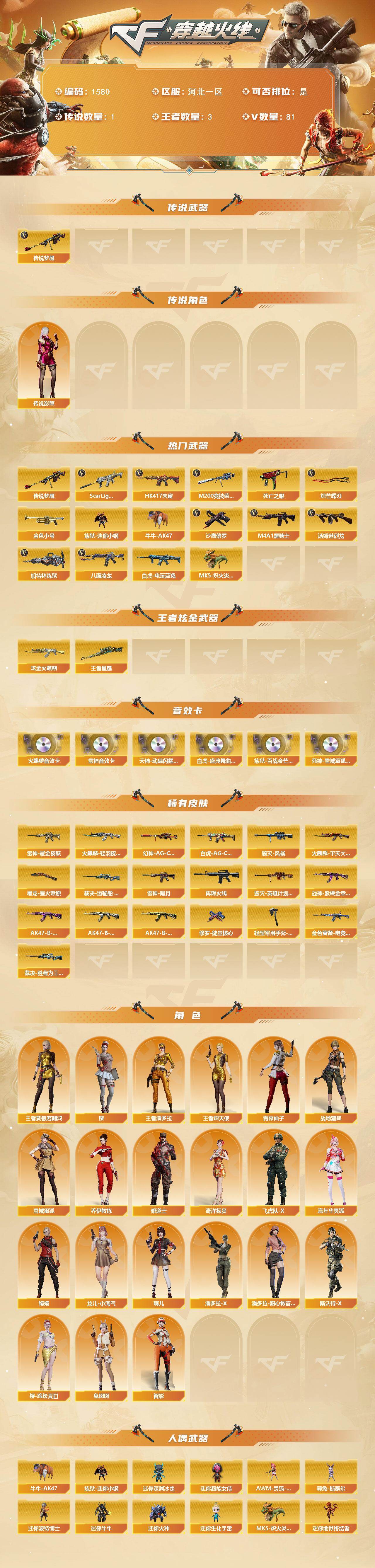 [15624240]河北一区-81V-3王者-1炫金 【传说武器】:传说梦魇 【传说角色】:传说影煞 【热门武器】:传说梦魇,Scar Light-白虎,HK417-朱雀,M200-竞技荣光,八面凌龙,死亡之眼,白虎-电玩蓝兔,金色小号,炼狱-迷你小钢,牛牛-AK47,M4A1-黑骑士,汤姆逊-烈龙*5,加特林-炼狱,MK5-炽火炎龙,沙鹰-修罗*2,炽芒蝶刃 【王者炫金武器】:王者星霆,炫金火麒麟 【音效卡】:天神-动感闪耀 音效卡,AK47-火麒麟音效卡,M4A1-雷神音效卡,白虎-盛典舞曲音效卡,炼狱-百战金芒-庆典舞曲音效卡,死神-雪域霜狐-怀旧音效卡 【皮肤】:幻神-AG-CFPLS17冠军,白虎-AG-CFPLS20冠军,金色蔷薇-电竞之星 皮肤,裁决-运输船 皮肤,裁决-胜者为王 皮肤,雷神-暗月,雷神-耀金皮肤,M4A1-再燃火线,火麒麟-轻羽皮肤,火麒麟-平天大圣,毁灭-风暴,毁灭-英雄计划 皮肤,战神-紫绶金章皮肤*2,AK47-B-常胜将军-曹操,AK47-B-常胜将军-刘备,AK47-B-常胜将军-孙权,修罗-能量核心,屠龙-星火燎原*3,轻型军用手斧-再燃火线 【角色】:樱,战地猎狐,王者葵-惊若翩鸿,王者潘多拉,王者炽天使,雪域霜狐,奇洋探员,乔伊教练,修道士,飞虎队-X,嘉年华灵狐,娟娟,龙儿-小淘气,萌儿,潘多拉-X,潘多拉-甜心教官,青霞仙子,斯沃特-X,兔囡囡,樱-缤纷夏日,智影 【人偶武器】:炼狱-迷你小钢,MK5-炽火炎龙,萌兔-斯泰尔,迷你地狱终结者,AWM-灵狐-15周年嘉年华,牛牛-AK47,迷你深渊冰龙*2,迷你波特博士*2,迷你牛牛*2,迷你火种*2,迷你生化手雷*2,迷你深渊冰龙-王绿豆,迷你超能女侍 【暴走生化】:死亡之眼,超级对讲机 【挑战大师】:试炼破坏者III,神圣爆裂者-末日III 【英雄级武器】:AK47-火麒麟,M4A1-雷神*2,M4A1-黑骑士,M4A1-死神,HK417-朱雀,Scar Light-白虎,无影-神兵利器,QBZ03-云龙,黑武士-锦绣游龙,超新星-热带奇洋,八面凌龙,死神-雪域霜狐,烈火-动感闪耀,王者之势-觉醒版,AK-47-猩红传说,白虎-电玩蓝兔,白虎之魄-觉醒版,Barrett-毁灭,AWM-裁决,Barrett-朱雀,M200-竞技荣光,VSK-94-金蚀,加特林-炼狱,炼狱-百战金芒,