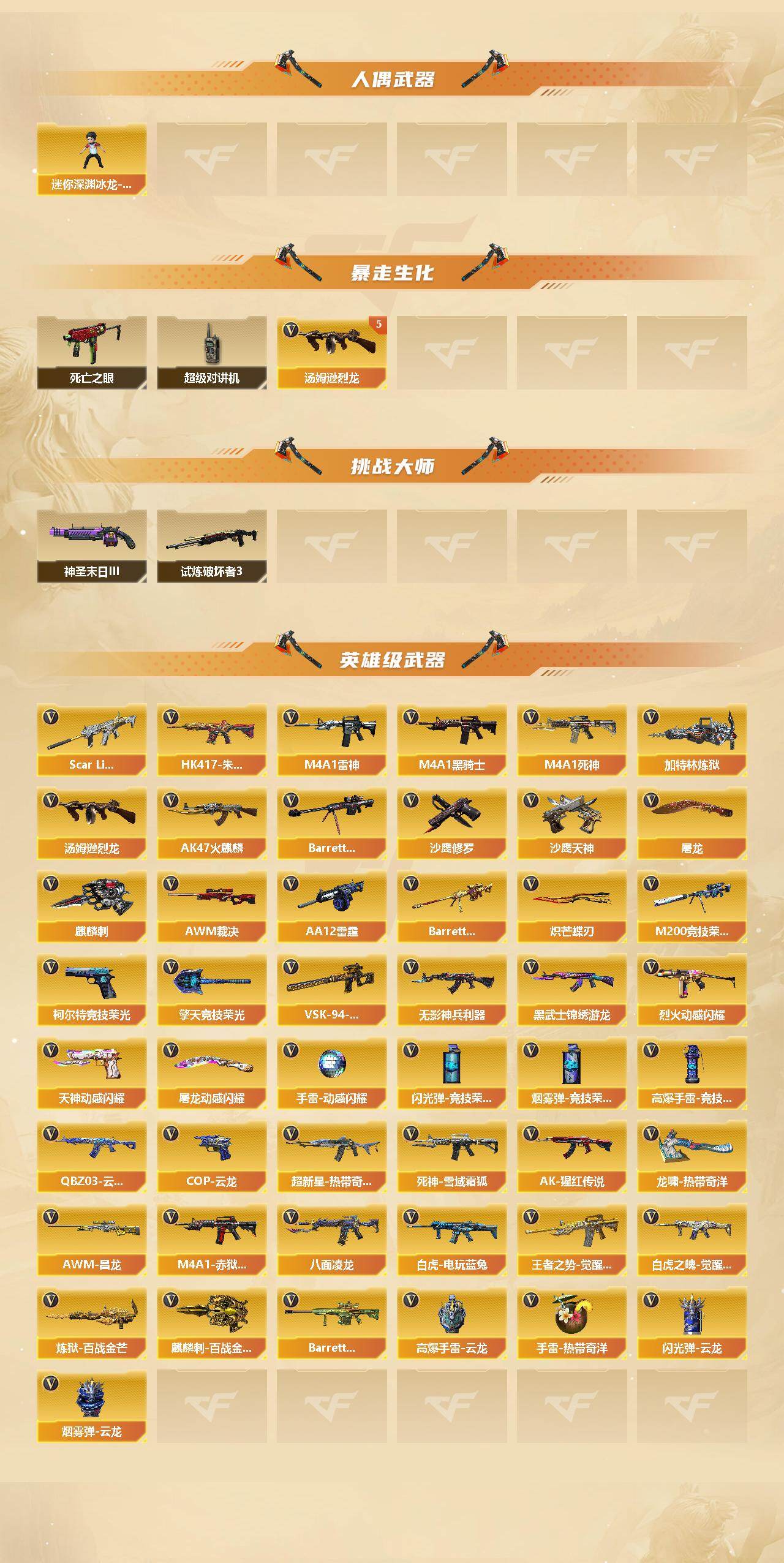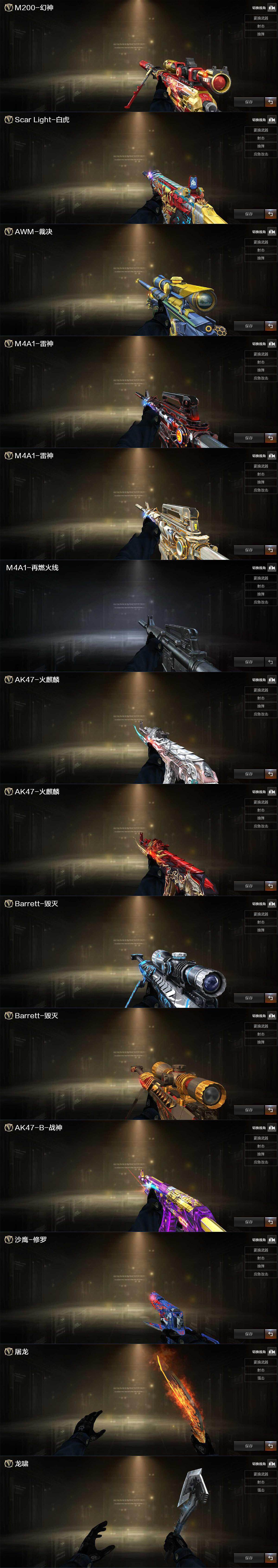 【英雄级武器】:AK47-火麒麟,M4A1-雷神*2,M4A1-黑骑士,M4A1-死神,HK417-朱雀,Scar Light-白虎,无影-神兵利器,QBZ03-云龙,黑武士-锦绣游龙,超新星-热带奇洋,八面凌龙,死神-雪域霜狐,烈火-动感闪耀,王者之势-觉醒版,AK-47-猩红传说,白虎-电玩蓝兔,白虎之魄-觉醒版,Barrett-毁灭,AWM-裁决,Barrett-朱雀,M200-竞技荣光,VSK-94-金蚀,加特林-炼狱,炼狱-百战金芒,