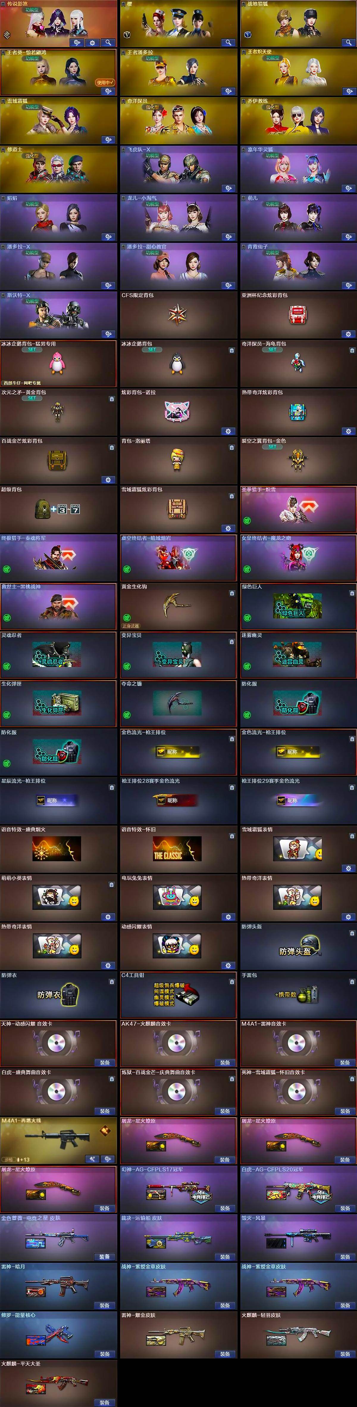 【皮肤】:幻神-AG-CFPLS17冠军,白虎-AG-CFPLS20冠军,金色蔷薇-电竞之星 皮肤,裁决-运输船 皮肤,裁决-胜者为王 皮肤,雷神-暗月,雷神-耀金皮肤,M4A1-再燃火线,火麒麟-轻羽皮肤,火麒麟-平天大圣,毁灭-风暴,毁灭-英雄计划 皮肤,战神-紫绶金章皮肤*2,AK47-B-常胜将军-曹操,AK47-B-常胜将军-刘备,AK47-B-常胜将军-孙权,修罗-能量核心,屠龙-星火燎原*3,轻型军用手斧-再燃火线