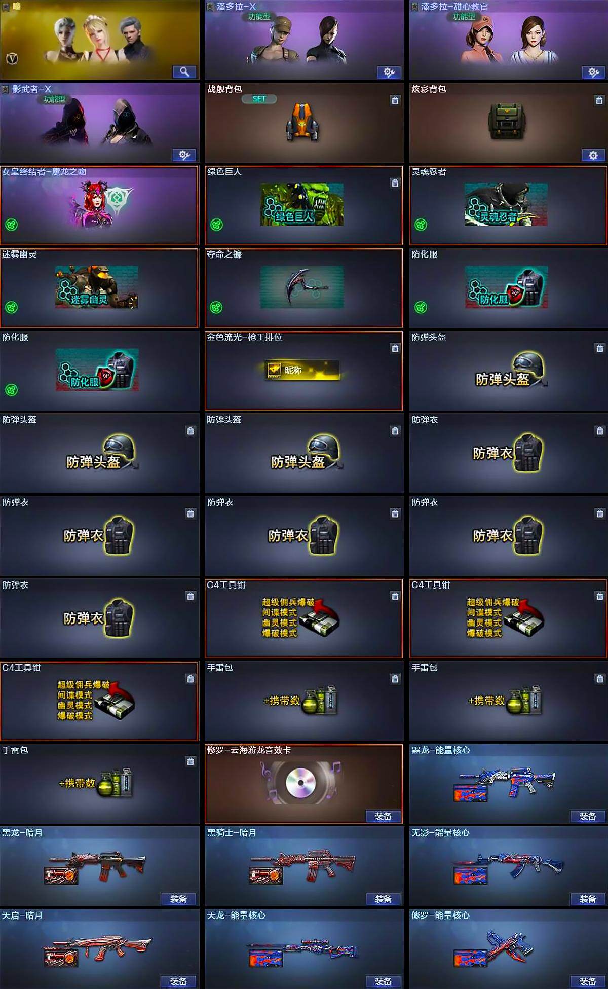 【道具】:战舰背包,炫彩背包,女皇终结者-魔龙之吻,绿色巨人,灵魂忍者,迷雾幽灵,夺命之镰,防化服*2,金色流光-枪王排位,防弹头盔*3,防弹衣*5,C4工具钳*3,手雷包*3