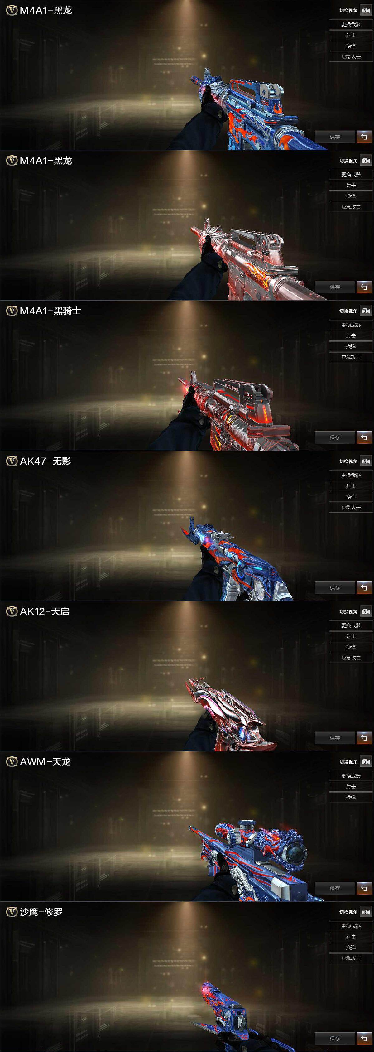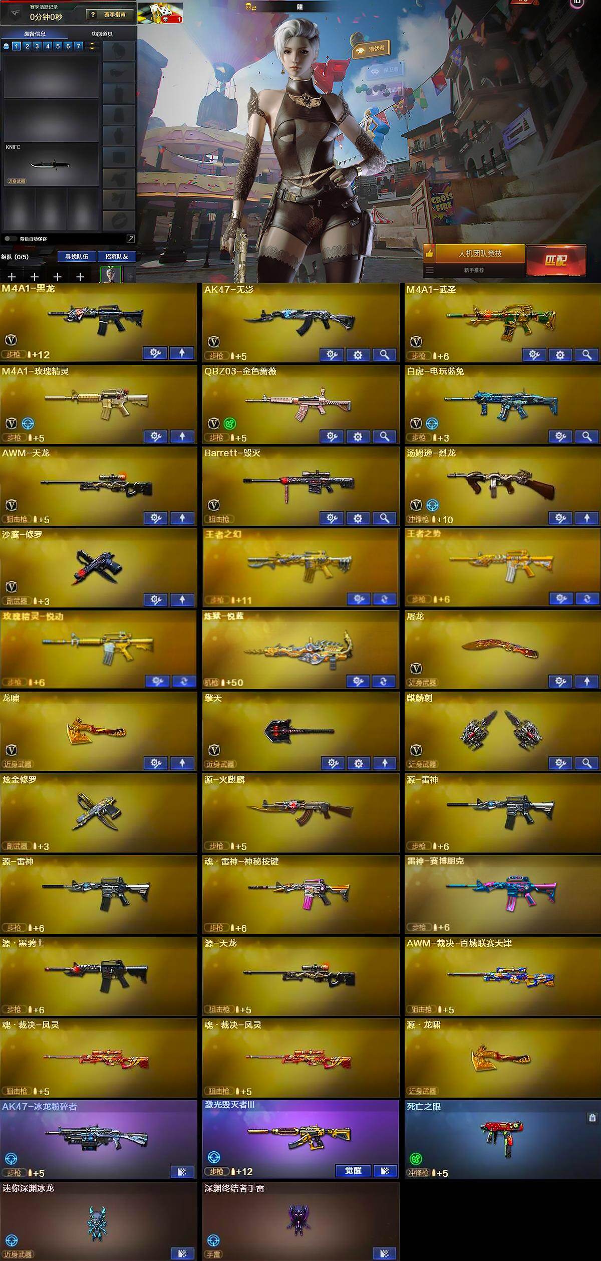 【英雄级武器】:M4A1-黑龙,AK47-无影,M4A1-武圣,M4A1-玫瑰精灵,QBZ03-金色蔷薇,白虎-电玩蓝兔,AWM-天龙,Barrett-毁灭,汤姆逊-烈龙,沙鹰-修罗,屠龙,龙啸,擎天,麒麟刺