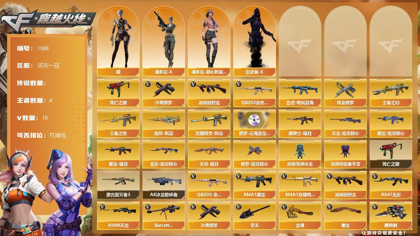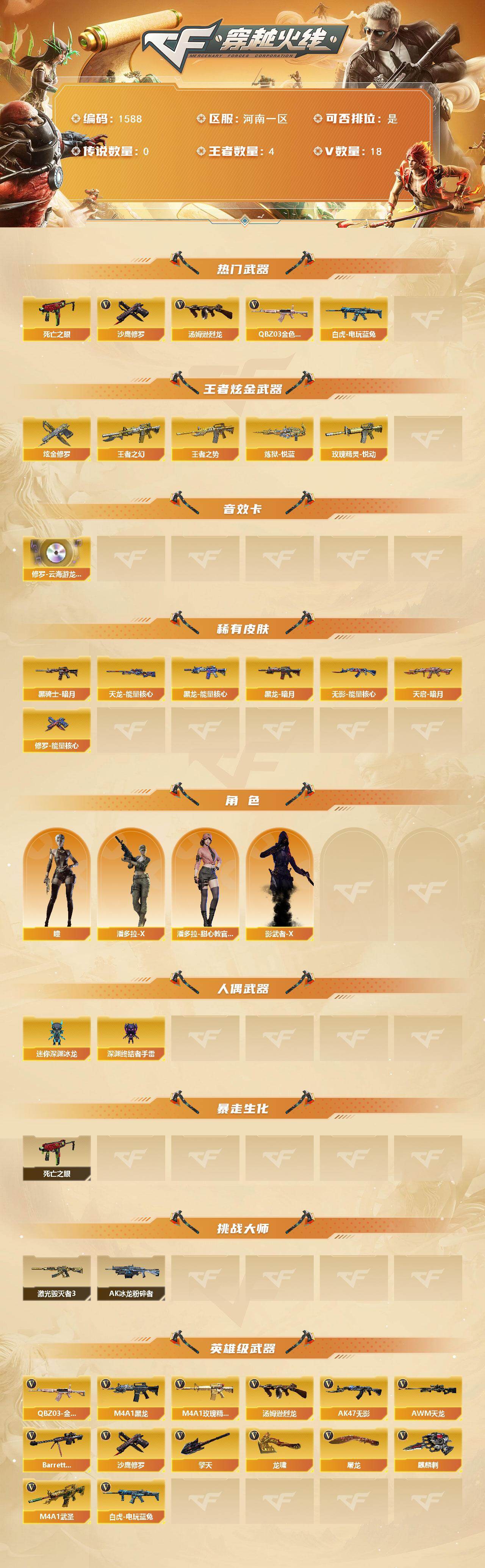 [15624570]河南一区-18V-4王者-1炫金 【热门武器】:QBZ03-金色蔷薇,死亡之眼,白虎-电玩蓝兔,汤姆逊-烈龙,沙鹰-修罗 【王者炫金武器】:王者之幻,王者之势,玫瑰精灵-悦动,炼狱-悦蓝,炫金修罗 【音效卡】:修罗-云海游龙音效卡 【皮肤】:黑龙-能量核心,黑龙-暗月,黑骑士-暗月,无影-能量核心,天启-暗月,天龙-能量核心,修罗-能量核心 【角色】:瞳,潘多拉-X,潘多拉-甜心教官,影武者-X 【人偶武器】:迷你深渊冰龙,深渊终结者手雷 【暴走生化】:死亡之眼 【挑战大师】:AK47-冰龙粉碎者,激光毁灭者III 【英雄级武器】:M4A1-黑龙,AK47-无影,M4A1-武圣,M4A1-玫瑰精灵,QBZ03-金色蔷薇,白虎-电玩蓝兔,AWM-天龙,Barrett-毁灭,汤姆逊-烈龙,沙鹰-修罗,屠龙,龙啸,擎天,麒麟刺 【道具】:战舰背包,炫彩背包,女皇终结者-魔龙之吻,绿色巨人,灵魂忍者,迷雾幽灵,夺命之镰,防化服*2,金色流光-枪王排位,防弹头盔*3,防弹衣*5,C4工具钳*3,手雷包*3 【特殊枪械】:1烈龙