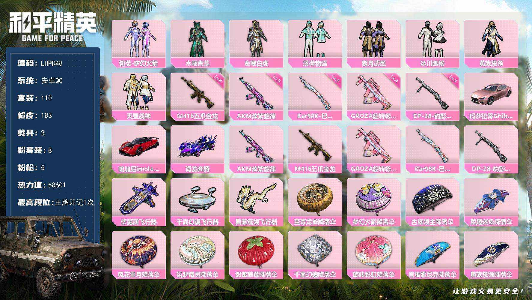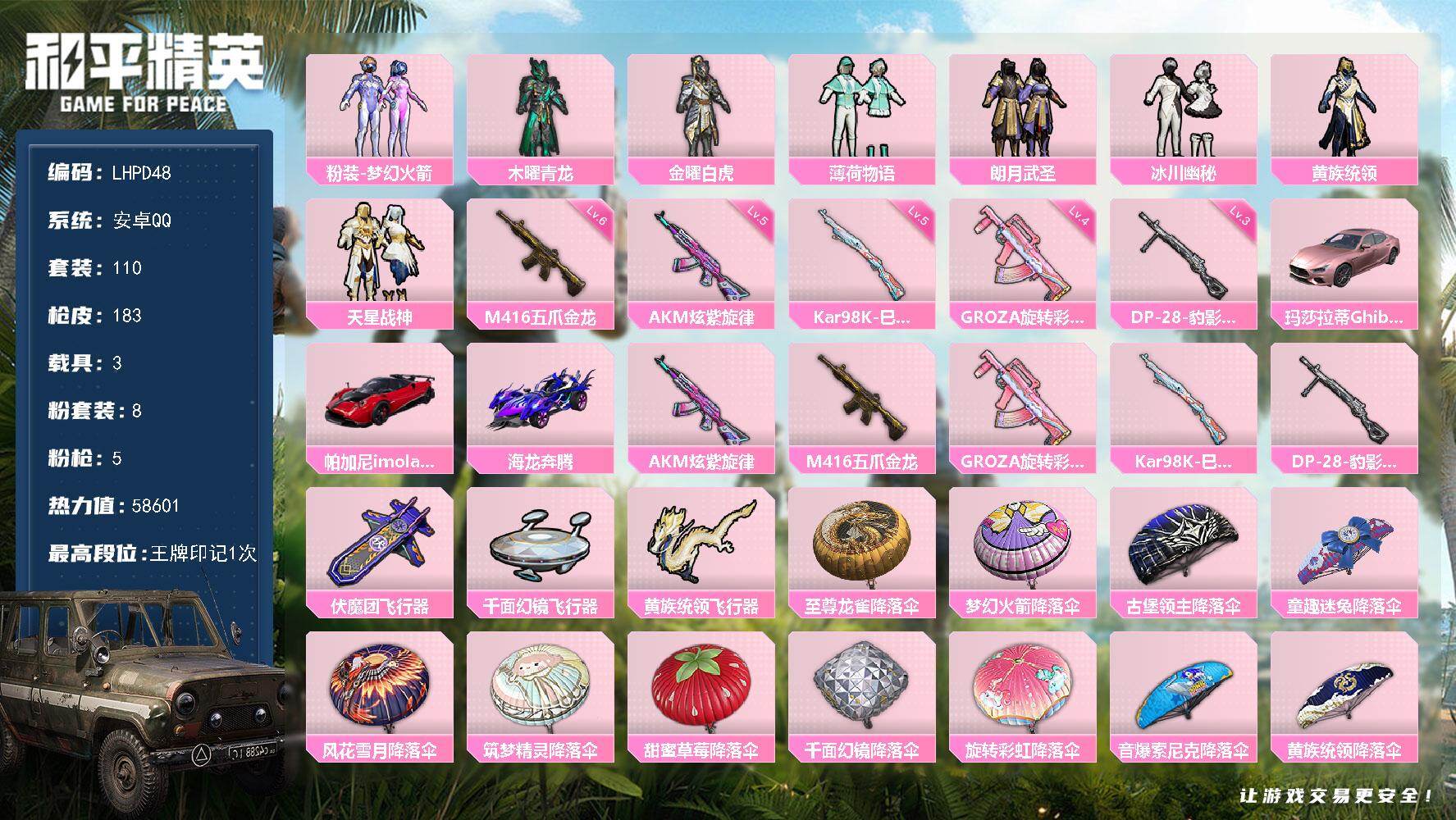[15630490]【特价出售/店主推荐】安卓 手Q-8粉装-5特效枪-3载具-3粉色飞行器-58601热力值-1王牌印记-110套装-183枪皮【热门品类】:粉装-梦幻火箭【粉色套装】:粉装-木曜青龙,粉装-金曜白虎,粉装-梦幻火箭,粉装-薄荷物语,粉装-朗月武圣,粉装-冰川幽秘,粉装-黄族统领,粉装-天星战神【粉色枪皮等级】:AKM-炫紫旋律(五级),M416-五爪金龙(六级),GROZA-旋转彩虹(四级),Kar98K-巳巳如意(五级),DP-28-豹影疾电(三级)【粉色载具】:玛莎拉蒂Ghibli(粉),帕加尼imola(光影红),海龙奔腾【粉色枪皮】:AKM-炫紫旋律,M416-五爪金龙,GROZA-旋转彩虹,Kar98K-巳巳如意,DP-28-豹影疾电【粉色飞行器】:伏魔团飞行器,千面幻镜飞行器,黄族统领飞行器
