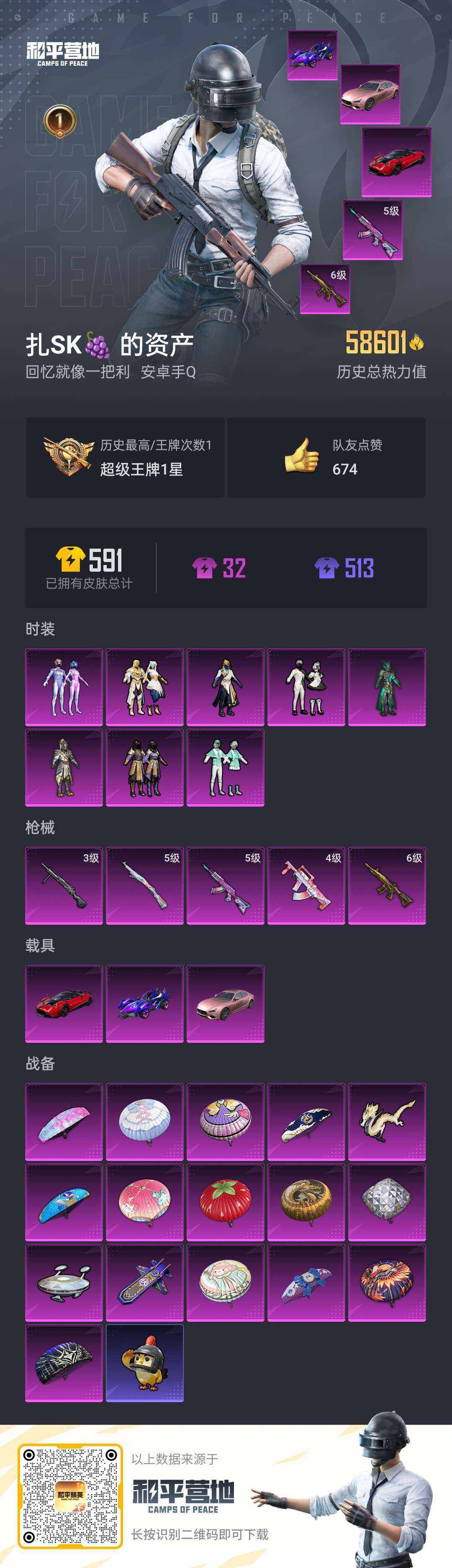 - PX_2100818-??/枪械19/装备655/载具3/战备295/王牌印记22/热力值155949/五级AKM-梦之光华/七级SCAR-L-青春物语/六级GROZA-旋转彩虹/七级AUG-星之彼岸/七级Vector-环太平洋/五级AKS-74U-信仰神谕/七级P90-粉樱探戈/五级Kar98K-巳巳如意/五级Mk14-精灵梦叶罗丽/一级AMR-炫光之旅/五级AMR-智耀战神/二级M417-第五