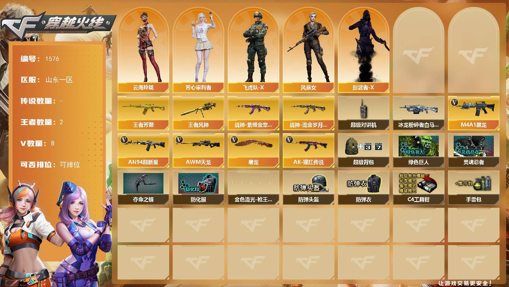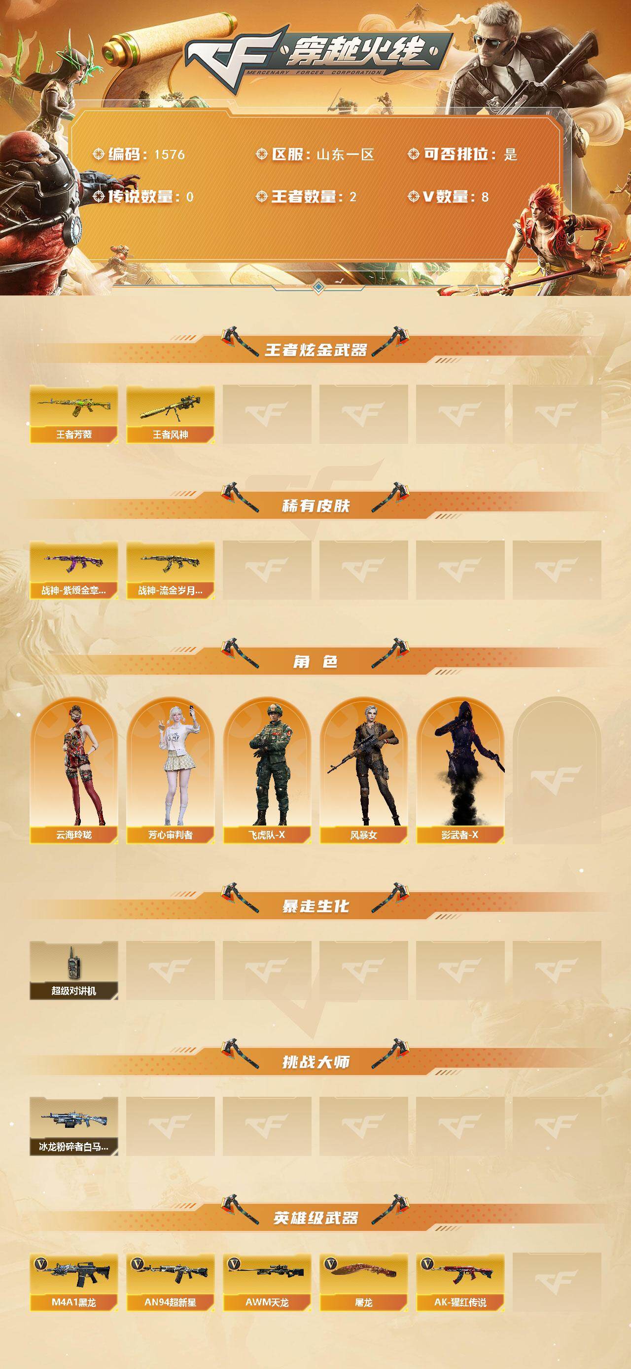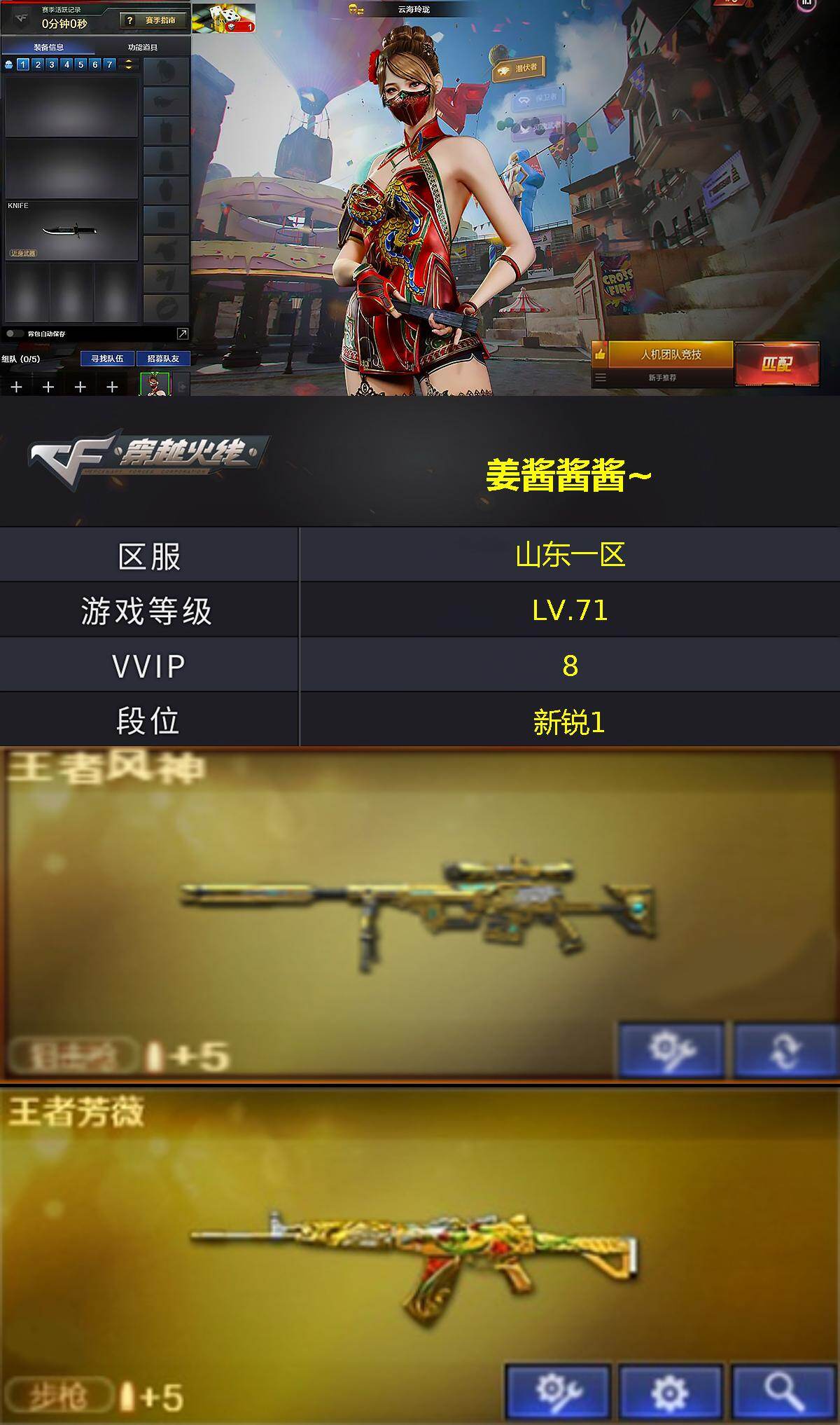 [15631001]山东一区-8V-2王者-0炫金 【王者炫金武器】:王者芳薇,王者风神 【皮肤】:战神-紫绶金章皮肤,战神-流金岁月皮肤 【角色】:云海玲珑,芳心审判者,飞虎队-X,风暴女,影武者-X 【暴走生化】:超级对讲机 【挑战大师】:冰龙粉碎者-白马银枪 【英雄级武器】:M4A1-黑龙,AN94-超新星,AK-47-猩红传说*2,AWM-天龙,屠龙*2 【道具】:超级背包,绿色巨人,灵魂忍者,夺命之镰,防化服,金色流光-枪王排位,星辰流光-枪王排位,枪王排位28赛季金色流光,防弹头盔*3,防弹衣*3,C4工具钳*2,手雷包*2 【特殊枪械】: