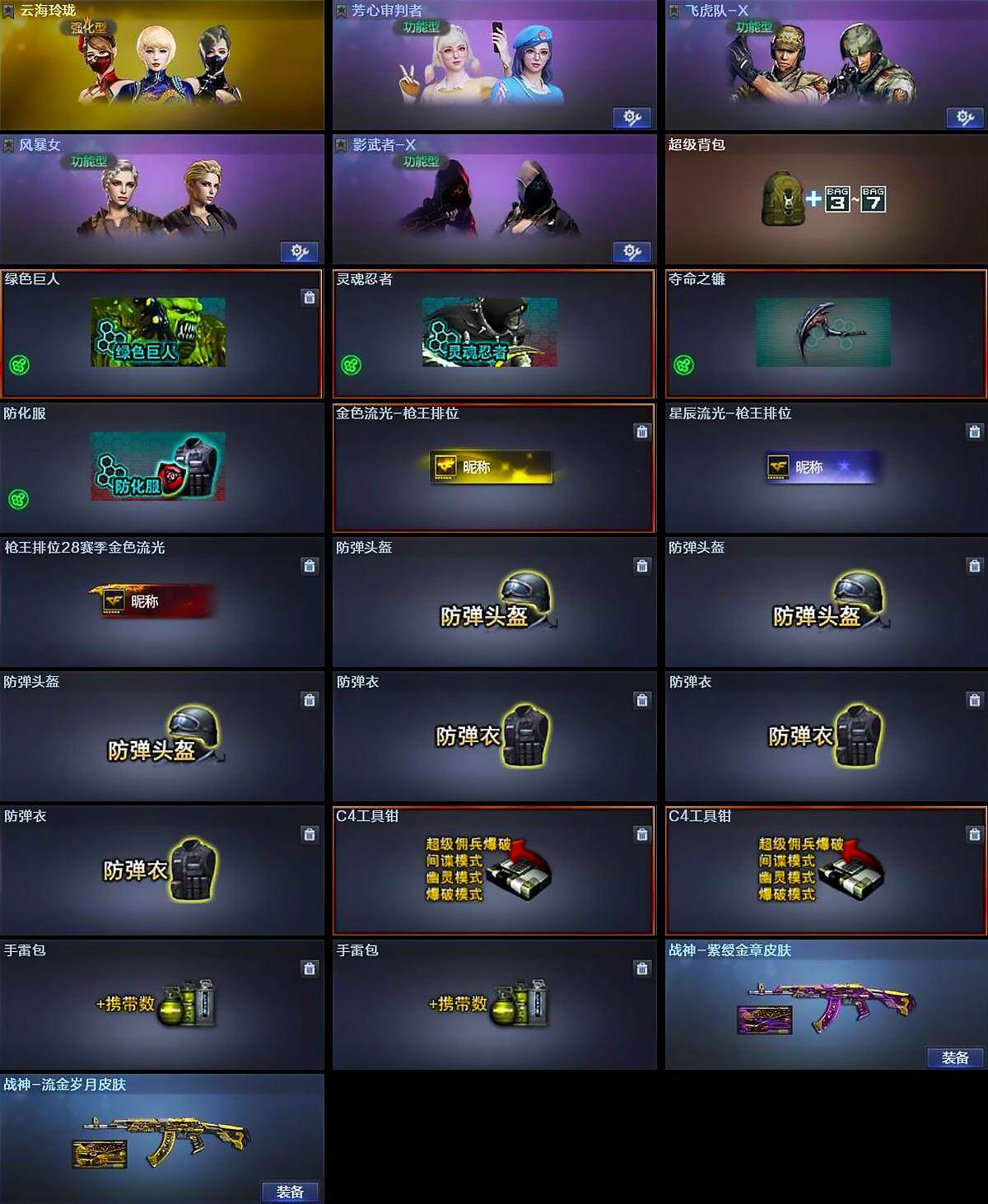 【道具】:超级背包,绿色巨人,灵魂忍者,夺命之镰,防化服,金色流光-枪王排位,星辰流光-枪王排位,枪王排位28赛季金色流光,防弹头盔*3,防弹衣*3,C4工具钳*2,手雷包*2