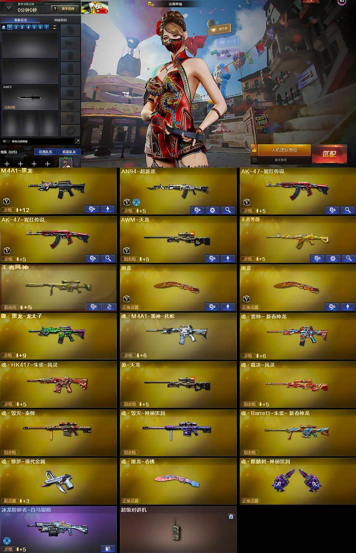 【英雄级武器】:M4A1-黑龙,AN94-超新星,AK-47-猩红传说*2,AWM-天龙,屠龙*2
