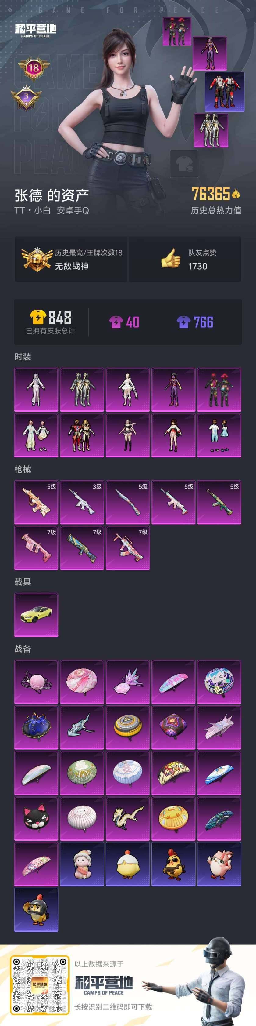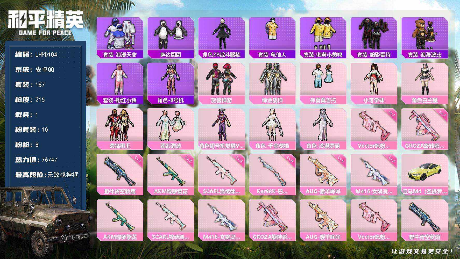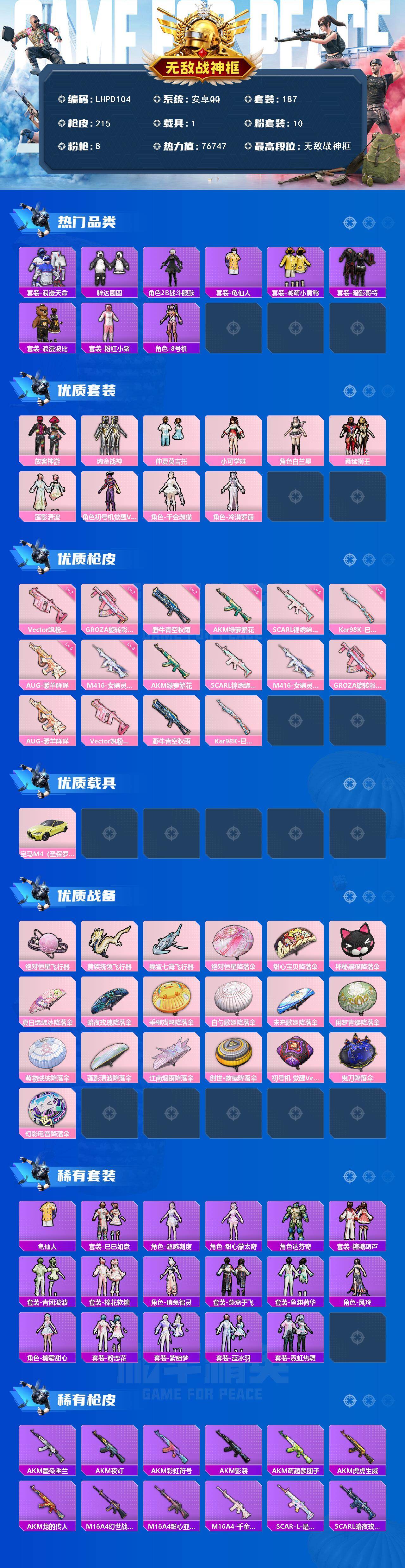 [15631399]【特价出售/店主推荐】安卓 手Q-无敌战神框-10粉装-8特效枪-1载具-4粉色飞行器-76747热力值-18王牌印记-187套装-215枪皮【热门品类】:套装-浪漫天命,套装-胖达圆圆,角色-2B战斗服款,套装-龟仙人,套装-潮萌小黄鸭,套装-暗影哥特,套装-浪漫波比,套装-粉红小猪,角色-8号机【粉色套装】:粉装-放客神游,粉装-绚金战神,粉装-仲夏莫吉托,角色-小可学妹,角色-白兰星,粉装-勇猛狮王,粉装-莲影清波,角色-初号机 觉醒Ver.,角色-千金淑猫,角色-冷漠罗丽【粉色枪皮等级】:AKM-绿萝繁花(五级),SCAR-L-锦绣绵绵(五级),M416-女娲灵识(三级),GROZA-旋转彩虹(七级),AUG-暖羊咩咩(五级),Vector-飒粉甜心(七级),野牛-青空秋雨(七级),Kar98K-巳巳如意(五级)【粉色载具】:宝马M4(圣保罗黄)【粉色枪皮】:AKM-绿萝繁花,SCAR-L-锦绣绵绵,M416-女娲灵识,GROZA-旋转彩虹,AUG-暖羊咩咩,Vector-飒粉甜心,野牛-青空秋雨,Kar98K-巳巳如意【粉色飞行器】:绝对恒星飞行器,黄族统领飞行器,脆鲨七海飞行器