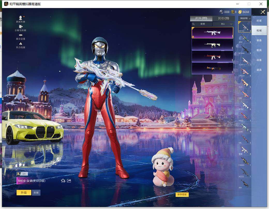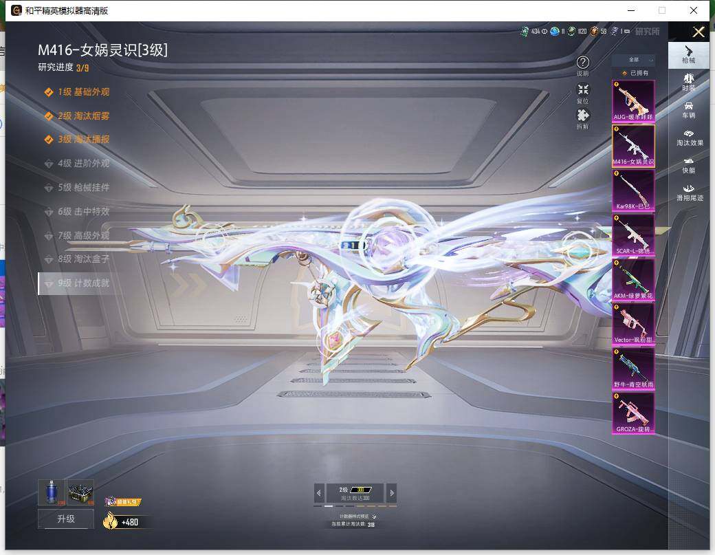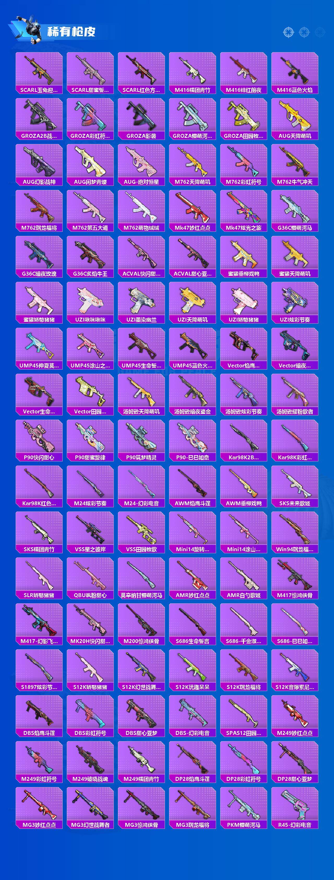 AKM-绿萝繁花,SCAR-L-锦绣绵绵,M416-女娲灵识,GROZA-旋转彩虹,AUG-暖羊咩咩,Vector-飒粉甜心,野牛-青空秋雨,Kar98K-巳巳如意