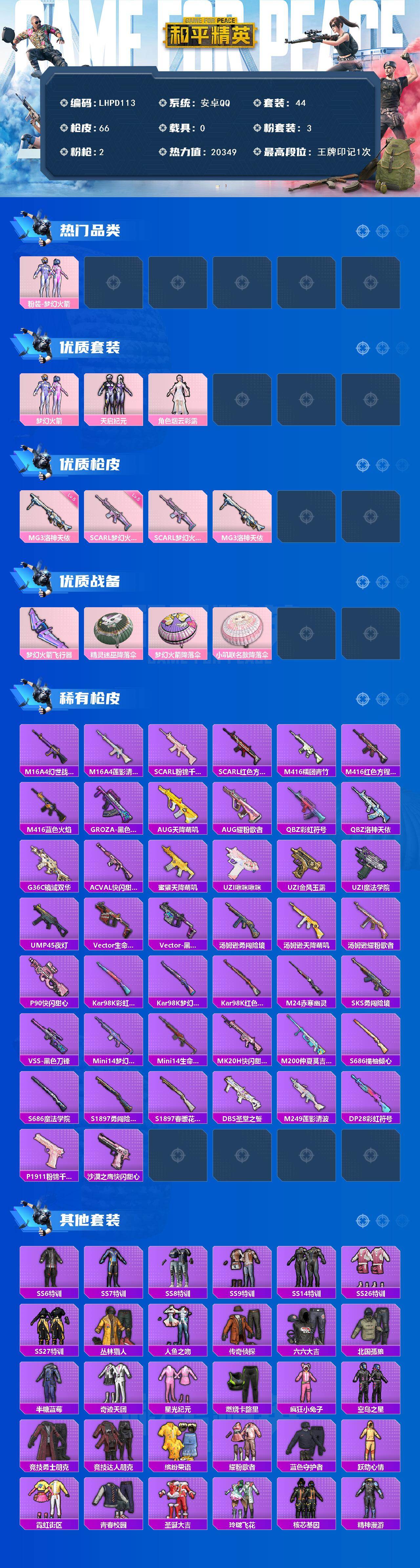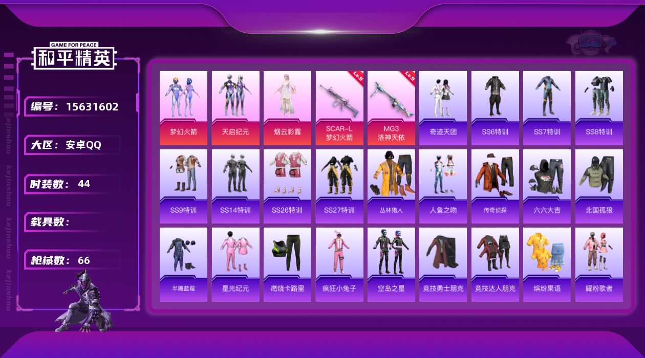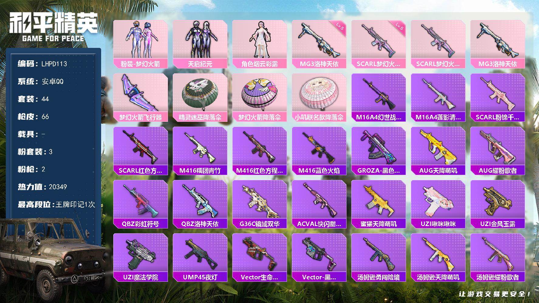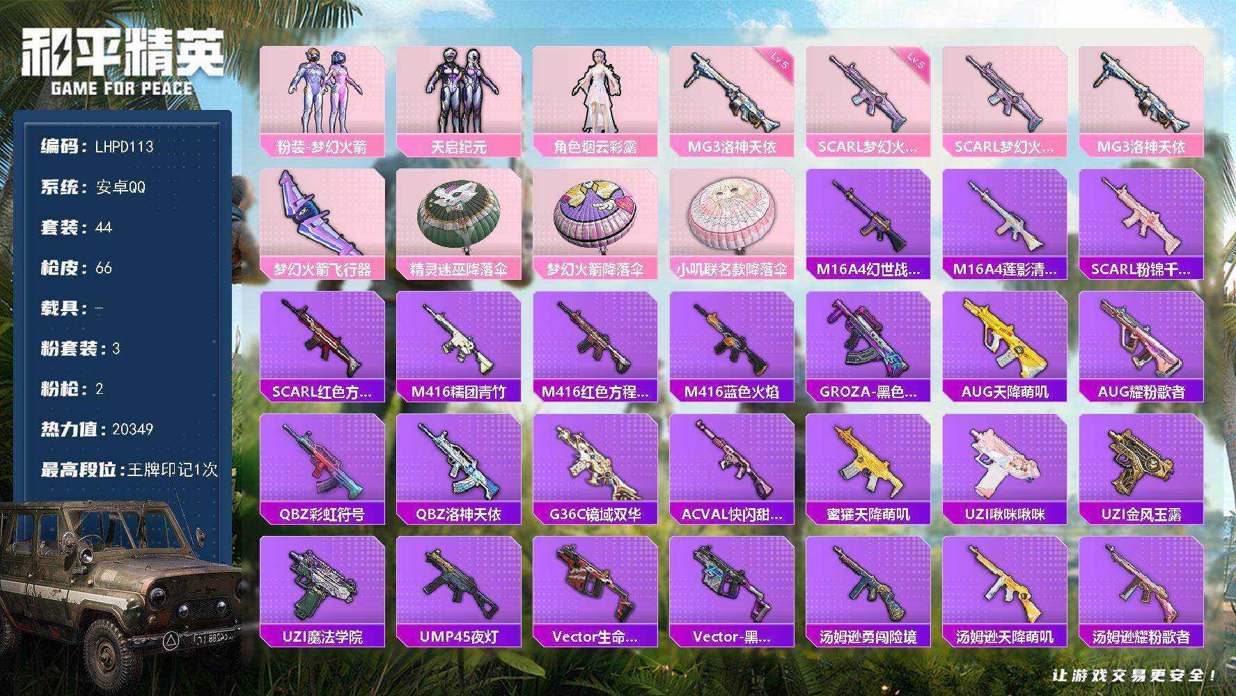 [15631602]【特价出售/店主推荐】安卓 手Q-3粉装-2特效枪-0载具-1粉色飞行器-20349热力值-1王牌印记-44套装-66枪皮【热门品类】:粉装-梦幻火箭【粉色套装】:粉装-梦幻火箭,粉装-天启纪元,角色-烟云彩露【粉色枪皮等级】:SCAR-L-梦幻火箭(五级),MG3-洛神天依(五级)【粉色枪皮】:SCAR-L-梦幻火箭,MG3-洛神天依【粉色飞行器】:梦幻火箭飞行器