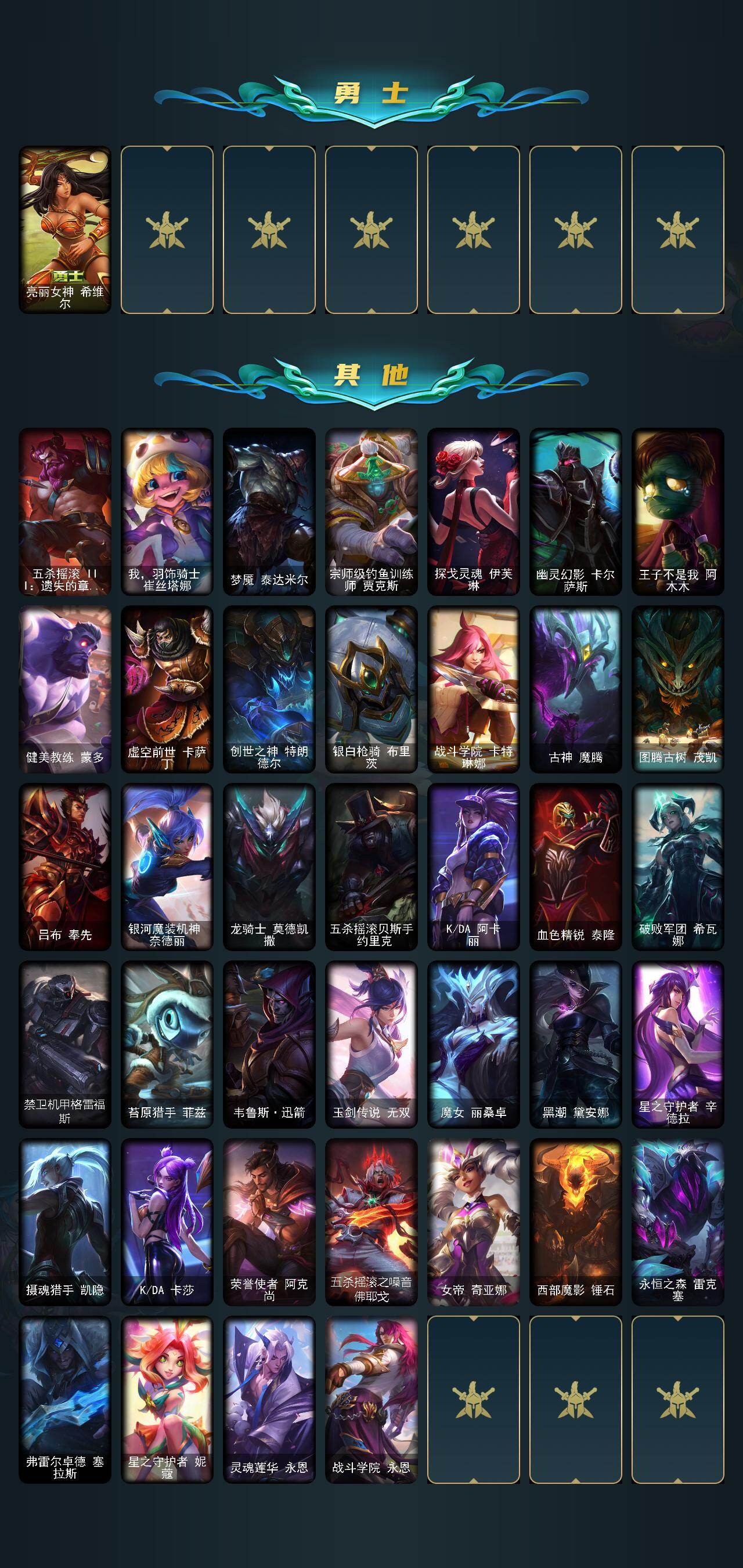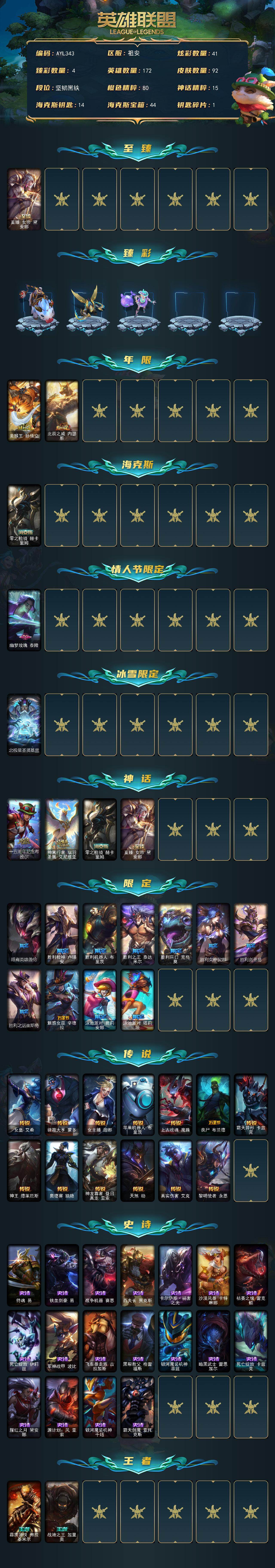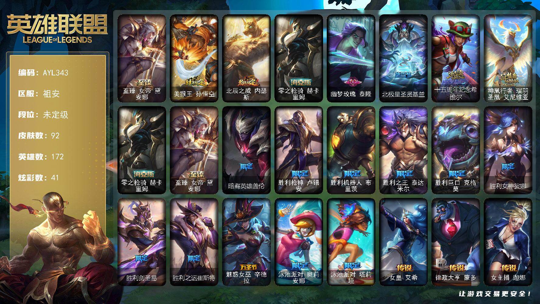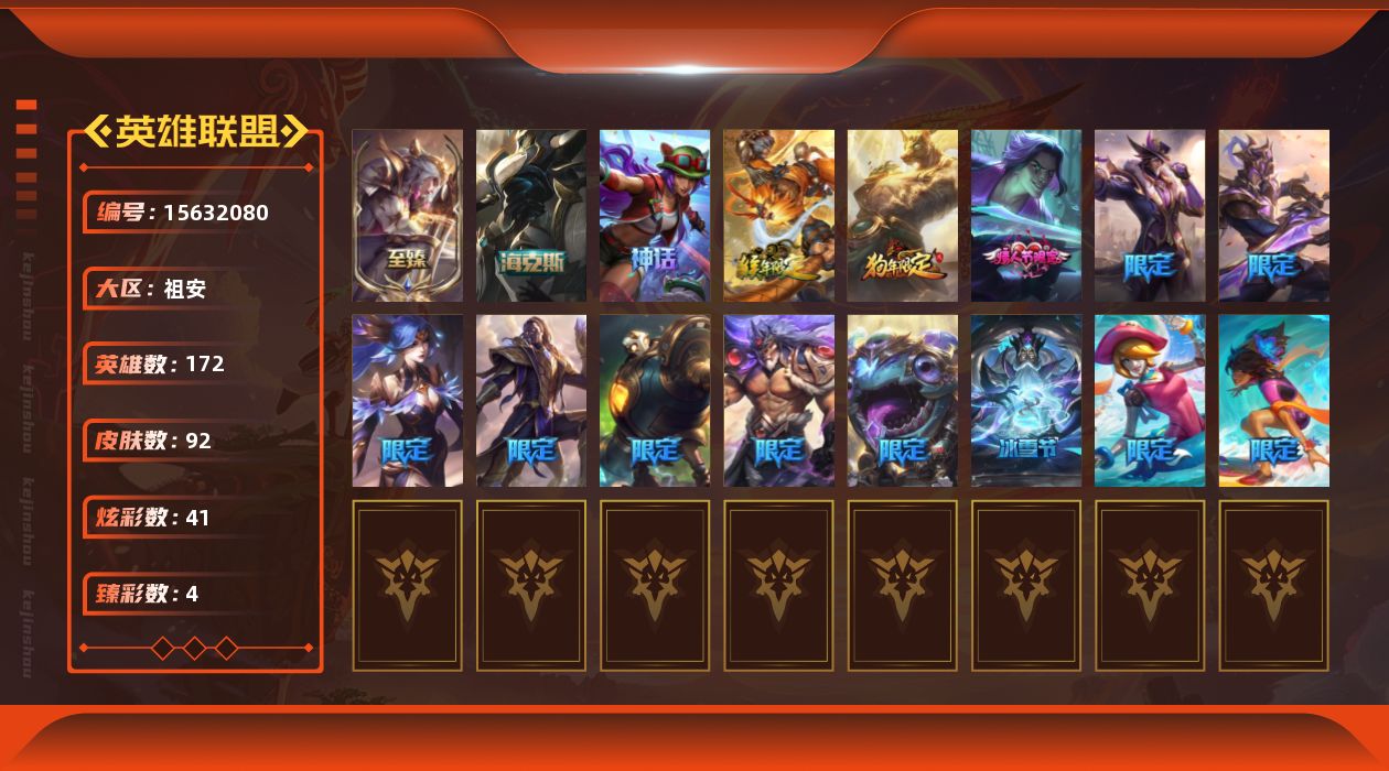 [15632080]未定级段位-172英雄-92皮肤-41炫彩-0终极-4神话-15限定-13传说-18史诗【至臻皮肤】:至臻女帝黛安娜【臻彩皮肤】:无畏骑士瑟庄妮赤子初心,冠军掠夺者卡兹克凯旋圣装,星之守护者娑娜未来之光,泳池派对奥莉安娜优雅珠光鲸【年限皮肤】:美猴王孙悟空,北辰之威内瑟斯【海克斯皮肤】:零之枪骑赫卡里姆【情人节限定】:幽梦玫瑰泰隆【冰雪限定】:北极星圣贤基兰【神话皮肤】:十五周年纪念希维尔,神凰行者瑞羽圣凰艾尼维亚,零之枪骑赫卡里姆,至臻女帝黛安【限定皮肤】:暗裔英雄盖伦,胜利枪神卢锡安,胜利机器人布里茨,胜利之王泰达米尔,胜利巨口克格莫,胜利女神娑娜,胜利剑圣易,胜利之运崔斯特,魅惑女巫辛德拉,泳池派对奥莉安娜,泳池派对塔莉垭【传说皮肤】:女皇艾希,律政大亨蒙多,女主播迦娜,苹果机器人布里茨,上古战魂魔腾,丧尸布兰德,霸天异形卡兹克,神王德莱厄斯,奥德赛凯隐,神龙尊者昼日真龙亚索,天煞劫,真实伤害艾克,黎明使者永恩【史诗皮肤】:侍魂易,铁血剑豪易,战争机器赛恩,百夫长贾克斯,卡尔萨斯祸害之光,沙漠风暴卡特琳娜,枯萎之壤雷克顿,死亡绽放伊莉丝,军神战甲波比,飞车暴走族古拉加斯,黑帮教父格雷福斯,银河魔装机神菲兹,暗黑武士雷恩加尔,死亡绽放卡兹克,腥红之月黛安娜,源计划风亚索,银河魔装机神千珏,霸天剑魔亚托克斯【王者皮肤】:霹雳游侠弗拉基米尔,战地之王加里奥【勇士皮肤】:亮丽女神希维尔【其他皮肤1】:五杀摇滚III遗失的章节奥拉夫,我羽饰骑士崔丝塔娜,梦魇泰达米尔,宗师级钓鱼训练师贾克斯,探戈灵魂伊芙琳,幽灵幻影卡尔萨斯,王子不是我阿木木,健美教练蒙多,虚空前世卡萨丁,创世之神特朗德尔,银白枪骑布里茨,战斗学院卡特琳娜,古神魔腾,图腾古树茂凯,吕布奉先,银河魔装机神奈德丽,龙骑士莫德凯撒,五杀摇滚贝斯手约里克,KDA阿卡丽,血色精锐泰隆,破败军团希瓦娜,禁卫机甲格雷福斯,苔原猎手菲兹,韦鲁斯迅箭,玉剑传说无双,魔女丽桑卓,黑潮黛安娜,星之守护者辛德拉,摄魂猎手凯隐,KDA卡莎,荣誉使者阿克尚,五杀摇滚之噪音佛耶戈,女帝奇亚娜,西部魔影锤石,永恒之森雷克塞,弗雷尔卓德塞拉斯,星之守护者妮蔻,灵魂莲华永恩,战斗学院永恩