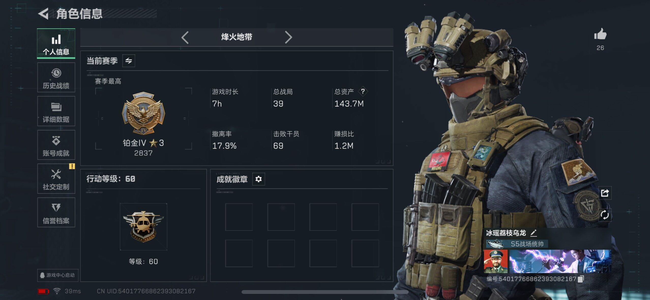 [15632100]143m总资产-11284k哈伏币-60烽火等级-铂金-50战场等级-上等兵